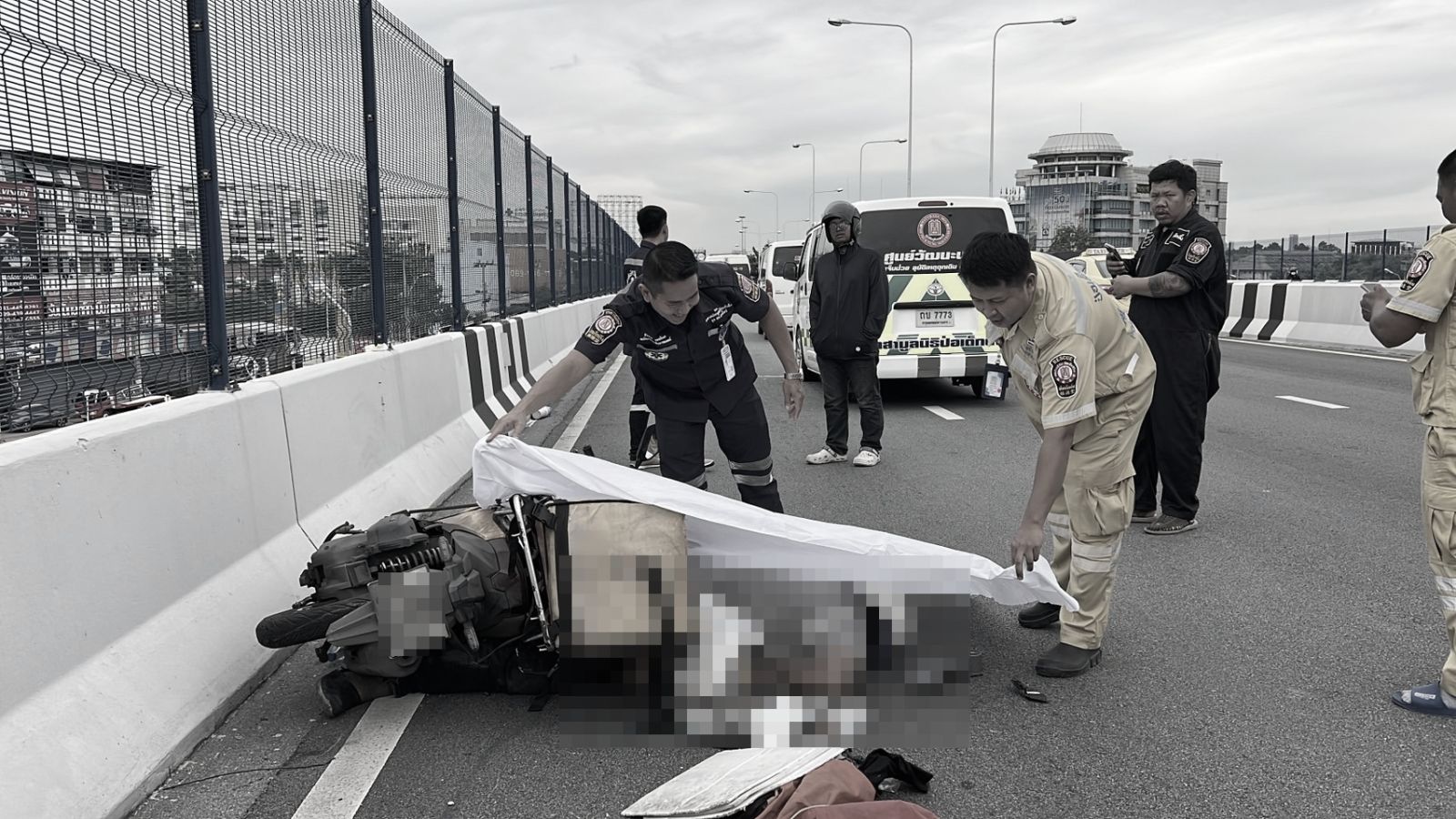 ที่เกิดเหตุ พบร่างผู้เสียชีวิต รายที่ 1 คือ ชายไทย อายุ 44 ปี เป็นเจ้าหน้าที่รักษาความปลอดภัยของบริษัทเอกชนแห่งหนึ่ง นอนเสียชีวิตอยู่ข้างรถยนต์กระบะยี่ห้อ อีซูซุ สีเทา ป้ายทะเบียน กทม. ที่กันชนท้ายรถมุมขวาพบร่องรอยชนยุบเสียหาย ห่างออกไปพบรถจักรยานยนต์ ยี่ห้อ ฮอนด้า รุ่น เวฟ สีน้ำเงิน-ดำ ป้ายทะเบียน กทม. ของผู้เสียชีวิตจอดอยู่ และพบรถจักรยานยนต์ยี่ห้อ ฮอนด้า รุ่นคลิก สีเหลือง-ดำ ทะเบียน กทม. อยู่ในลักษณะล้มทับร่างของผู้เสียชีวิต รายที่ 2 คือ ชายไทย อายุ 46 ปี โดยจุดนี้ยังพบร่องรอยขูดที่แบริเออร์ขอบทาง