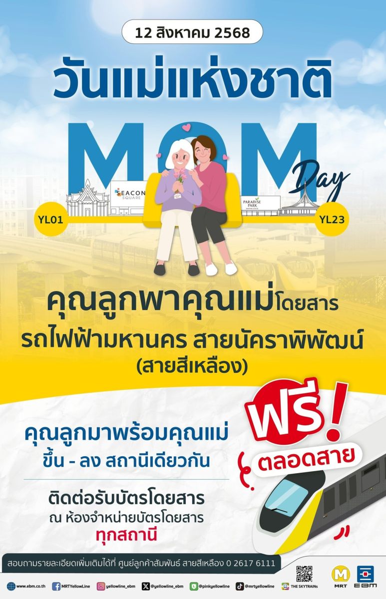 วันนี้ (7 สิงหาคม 2568) นายกาจผจญ อุดมธรรมภักดี ผู้ว่าการการรถไฟฟ้าขนส่งมวลชนแห่งประเทศไทย (รฟม.) กล่าวว่า เนื่องในโอกาสวันเฉลิมพระชนมพรรษา 12 สิงหาคม 2568 สมเด็จพระนางเจ้าสิริกิติ์ พระบรมราชินีนาถ พระบรมราชชนนีพันปีหลวง และถือเป็นวันแม่แห่งชาติด้วยนั้น รฟม. ได้ร่วมกับผู้รับสัมปทานรถไฟฟ้ามหานคร (รถไฟฟ้า MRT) ทั้ง 4 สาย ได้แก่ บริษัท ทางด่วนและรถไฟฟ้ากรุงเทพ จำกัด (มหาชน) (BEM) ผู้รับสัมปทานให้บริการรถไฟฟ้ามหานคร สายฉลองรัชธรรม (MRT สายสีม่วง) และ รถไฟฟ้ามหานคร สายเฉลิมรัชมงคล (MRT สายสีน้ำเงิน) บริษัท อีสเทิร์น บางกอกโมโนเรล จำกัด (EBM) ผู้รับสัมปทานให้บริการรถไฟฟ้ามหานคร สายนัคราพิพัฒน์ (MRT สายสีเหลือง) และบริษัท นอร์ทเทิร์น บางกอกโมโนเรล จำกัด (NBM) ผู้รับสัมปทานให้บริการรถไฟฟ้ามหานคร สายสีชมพู จัดกิจกรรมพิเศษยกเว้นค่าโดยสารรถไฟฟ้า MRT ทั้ง 4 สาย สำหรับคุณแม่ที่เดินทางพร้อมลูก ในวันที่ 12 สิงหาคม 2568 เพียงคุณแม่แสดงตัวที่ห้องออกบัตรโดยสาร เพื่อรับคูปองหรือบัตรโดยสารรถไฟฟ้าฟรีได้ทุกสถานี ตลอดระยะเวลาการเปิดให้บริการ โดยลูกชำระค่าโดยสารปกติ ทั้งนี้ เพื่อเป็นการอำนวยความสะดวกและส่งเสริมการเดินทางท่องเที่ยวสถานที่ต่างๆ รอบเส้นทางรถไฟฟ้า MRT ตลอดจนเป็นการส่งเสริมสร้างความผูกพันในสถาบันครอบครัว