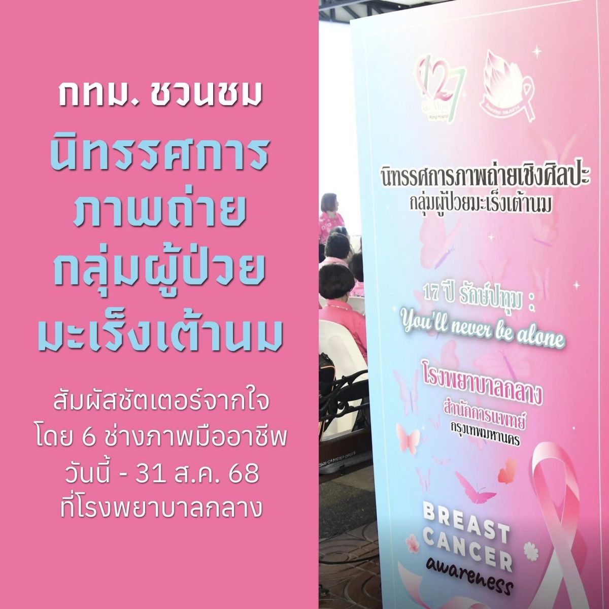 กทม. ชวนชมนิทรรศการภาพถ่ายกลุ่มผู้ป่วยมะเร็งเต้านมสุดประทับใจ สัมผัสชัตเตอร์จากใจโดย 6 ช่างภาพมืออาชีพ 6 - 31 ส.ค. นี้ ที่โรงพยาบาลกลาง