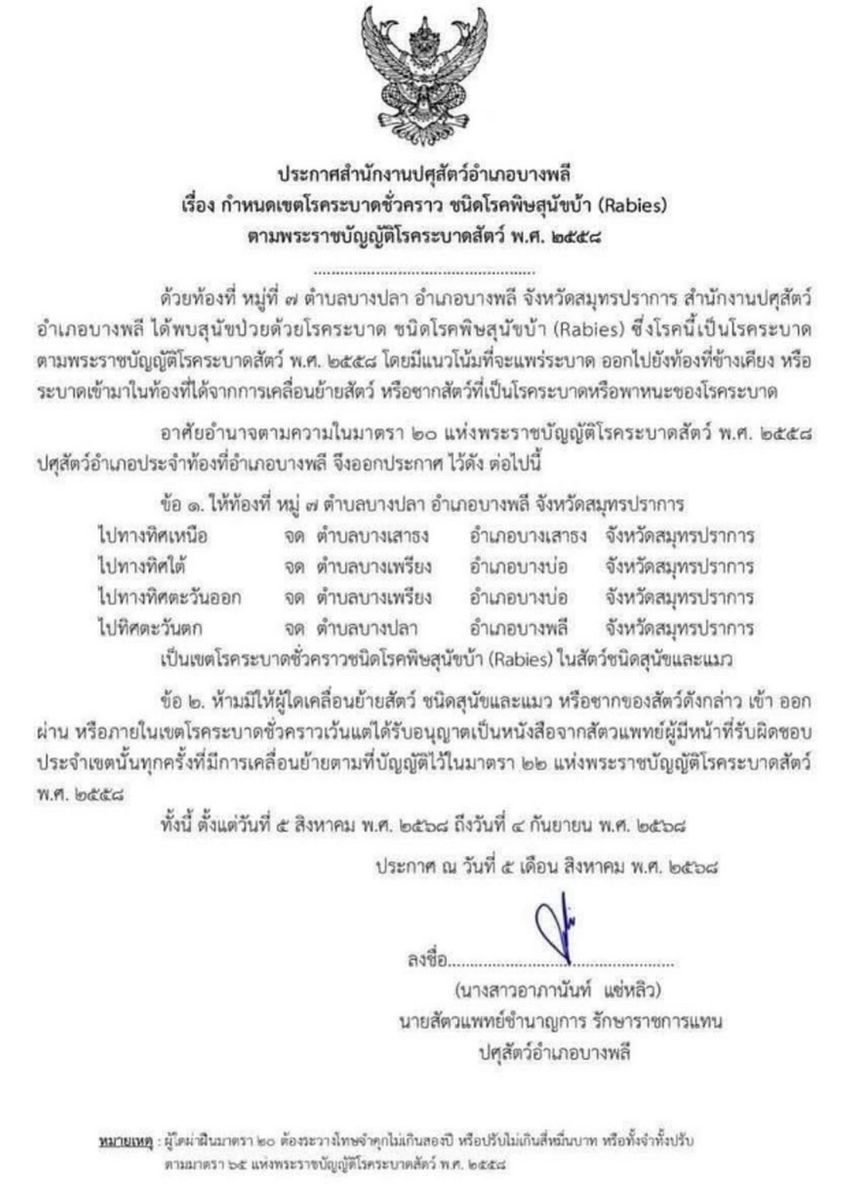 9 สิงหาคม 2568 สำนักงานปศุสัตว์อำเภอบางพลี ออกประกาศเขตโรคระบาดสัตว์ "โรคพิษสุนัขบ้า" โดยรายละเอียด ระบุว่า "เรื่อง กำหนดเขตโรคระบาดชั่วคราว ชนิดโรคพิษสุนัขบ้า ตามพระราชบัญญัติโรคระบาดสัตว์ พ.ศ. 2558