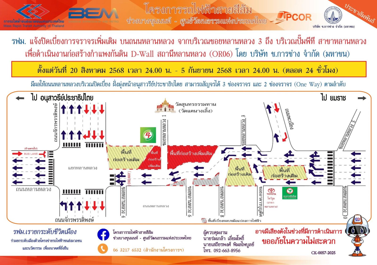 รฟม. แจ้งปิดเบี่ยงการจราจรเพิ่มเติม บนถนนหลานหลวง จากบริเวณซอยหลานหลวง 3 ถึง บริเวณปั้มพีที สาขาหลานหลวง เพื่อดำเนินงานก่อสร้างกำแพงกันดิน D-Wall สถานีหลานหลวง (OR06) โครงการรถไฟฟ้าสายสีส้ม ช่วงบางขุนนนท์ - ศูนย์วัฒนธรรมแห่งประเทศไทย ตั้งแต่วันที่ 20 สิงหาคม 2568 เวลา 24.00 น. – 5 กันยายน 2568 เวลา 24.00 น. (ตลอด 24 ชั่วโมง)