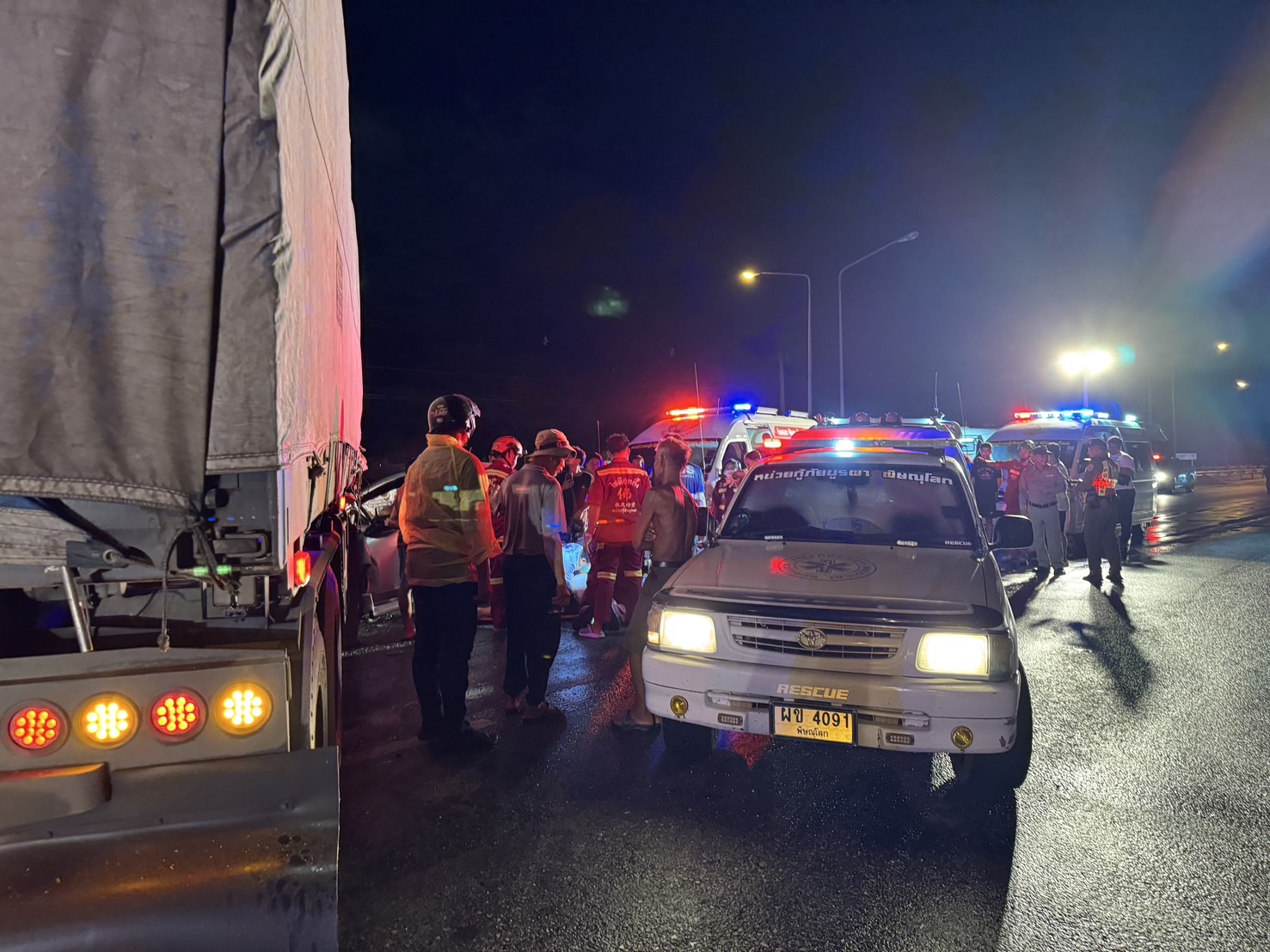 เมื่อเวลา 20.48 น. วันที่ 10 สิงหาคม 2568 ศูนย์รับแจ้งจาก สมาคมพิษณุโลกการกุศลสงเคราะห์ รับแจ้งมีอุบัติเหตุ รถยนต์เก๋งเฉี่ยวชนกับรถบรรทุกพ่วง 18 ล้อ และมีผู้บาดเจ็บติดค้างอยู่ภายในยานพาหนะ บน ถนนสายพิษณุโลก - อุตรดิตถ์ บริเวณใกล้เคียงทางเข้าวัดเทพกุญชรทรงธรรม ม.10 บ.คลองช้าง ต.วัดโบสถ์ อ.วัดโบสถ์ จ.พิษณุโลก
