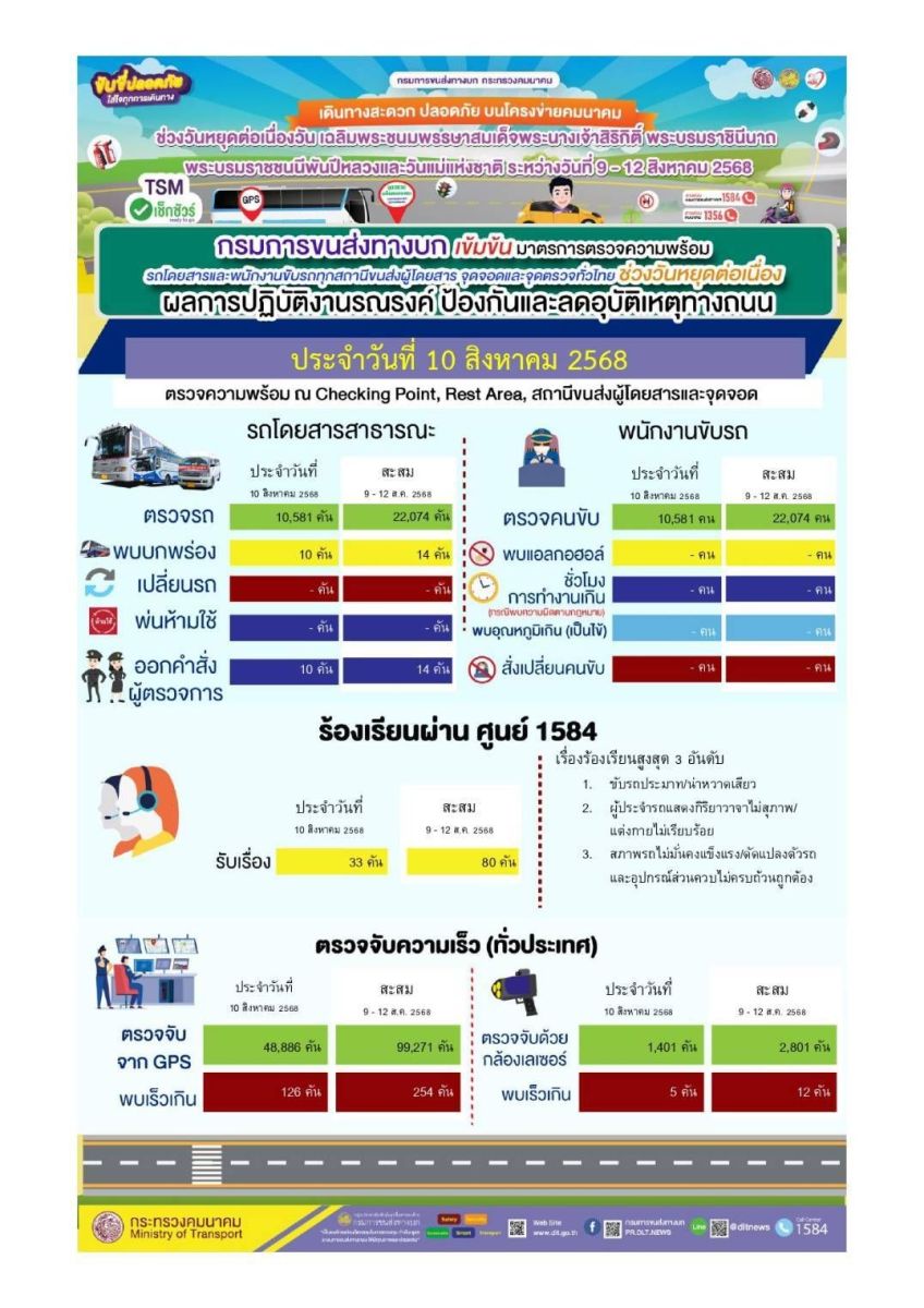 นายจิรุตม์ วิศาลจิตร อธิบดีกรมการขนส่งทางบก เปิดเผยว่า กรมการขนส่งทางบก ได้ดำเนินการตามมาตรการอำนวยความสะดวกและปลอดภัย ช่วงวันหยุดต่อเนื่องวันเฉลิมพระชนมพรรษาสมเด็จพระนางเจ้าสิริกิติ์ พระบรมราชินีนาถ พระบรมราชชนนีพันปีหลวง และวันแม่แห่งชาติ โดยมีมาตรการตรวจความพร้อมรถโดยสารสาธารณะและพนักงานขับรถ ณ สถานีขนส่งผู้โดยสาร จุดจอด Rest Area และจุดตรวจรถโดยสารสาธารณะ Check Point ทั่วประเทศระหว่างวันที่ 9 – 12 สิงหาคม 2568 เพื่อป้องกันและลดอุบัติเหตุทางถนน โดยเน้นย้ำให้ผู้ประกอบการขนส่ง ผู้ให้บริการสถานีขนส่งผู้โดยสารและจุดจอดทุกแห่ง ตรวจความพร้อมของรถและความพร้อมของผู้ขับรถก่อนออกเดินทาง ตามแบบ Checklist เช่น การมีใบอนุญาตขับรถที่ถูกต้อง ตามประเภทใบอนุญาตขับรถและไม่หมดอายุ ตรวจความพร้อมด้านร่างกาย และการตรวจวัดระดับแอลกอฮอล์ในลมหายใจต้องเป็นศูนย์มิลลิกรัมเปอร์เซ็นต์ ชั่วโมงการขับรถไม่เกินที่กฎหมายกำหนด รถโดยสารสาธารณะทุกคันต้องมีสภาพมั่นคงแข็งแรงทั้งสภาพตัวรถภายนอกและภายใน รวมทั้งอุปกรณ์เพื่อความปลอดภัยต่างๆ เช่น ประตูฉุกเฉิน ค้อนทุบกระจก เข็มขัดนิรภัย ถังดับเพลิง ต้องพร้อมใช้งานอยู่เสมอ พร้อมจัดเจ้าหน้าที่ให้คำแนะนำและให้ความรู้แก่ผู้โดยสารกรณีเกิดเหตุฉุกเฉิน และขอให้ผู้โดยสารทุกที่นั่งคาดเข็มขัดนิรภัยตลอดการเดินทาง เพื่อป้องกันการบาดเจ็บและเสียชีวิตเมื่อรถเกิดอุบัติเหตุ สำหรับผลดำเนินการตรวจความพร้อม ในวันที่ 10 สิงหาคม 2568 ตรวจรถโดยสารสาธารณะแล้ว จำนวน 10,581 คัน พบรถบกพร่อง จำนวน 10 คัน โดยได้ดำเนินการออกคำสั่งผู้ตรวจการ ส่วนการตรวจความพร้อมพนักงานขับรถ จำนวน 10,581 ราย ไม่พบพนักงานขับรถบกพร่องและไม่พบว่ามีอุณหภูมิเกิน
