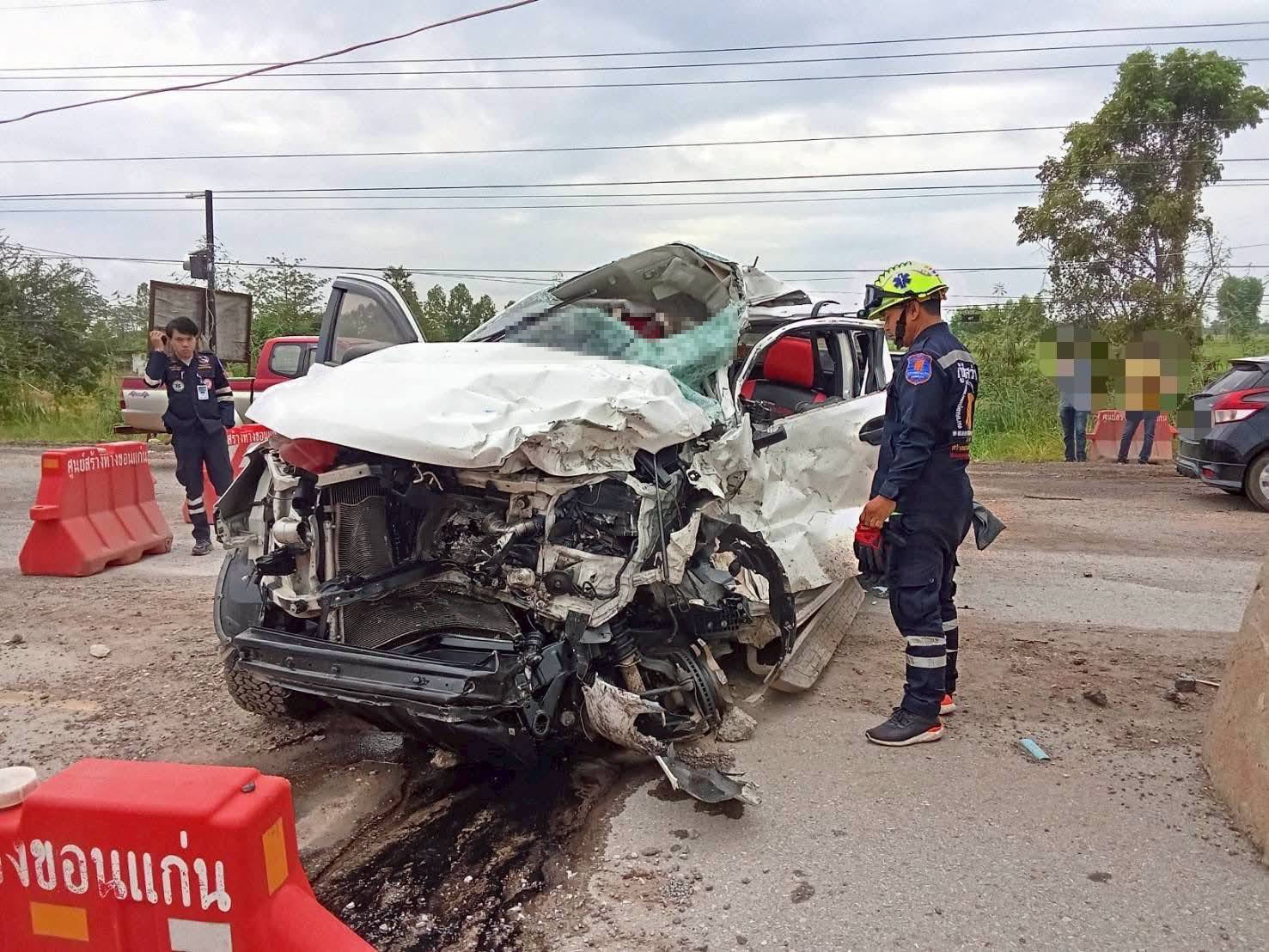 รถกระบะชนกับรถบรรทุกกลางถนน มีผู้เสียชีวิตในซากรถ จ.ขอนแก่น