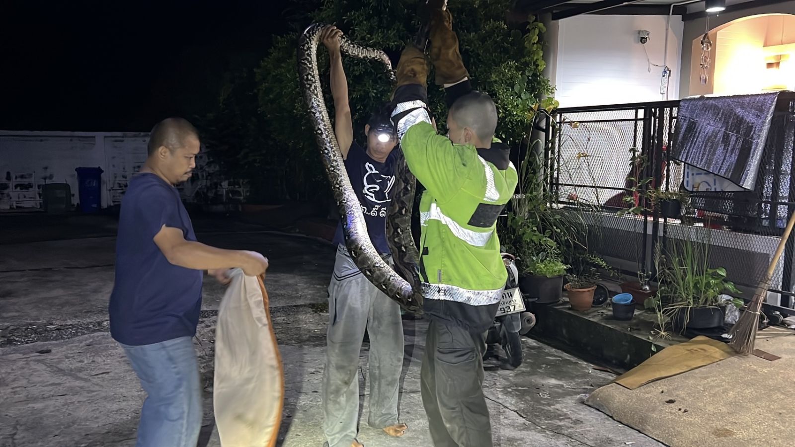 ที่เกิดเหตุเป็นบ้านทาวน์เฮาส์ 2 ชั้น บริเวณห้องครัวพบแผ่นฝ้าเพดานพังหลุดลงมาเสียหายไม่พบตัวงู โดยก่อนหน้านายชนะชน ได้บันทึกภาพตัวงูไว้เป็นหลักฐาน พบว่าเป็นงูเหลือมขนาดใหญ่ ตกลงมามาจากฝ้าเพดานแล้วเลื้อยหนีไปก่อนเจ้าหน้าที่กู้ภัยจะมาถึง ต่อมาทางเจ้าของบ้านและเพื่อนบ้านรวมทั้งกู้ภัยยังคงค้นหาอย่างต่อเนื่องเกรงว่างูนั้นจะหลบอยู่ภายในบ้านซึ่งเป็นอันตรายกับผู้พักอาศัย จนกระทั่งไปพบงูตัวดังกล่าวขดตัวอยู่ซอกกำแพงหลังบ้านที่อยู่ติดกัน หลังจากนั้นได้พยายามรื้อแผ่นสังกะสีที่ทำกันฝนหลังบ้านออก จนสามารถจับงูเหลือมตัวดังกล่าวออกมาได้สำเร็จ พบว่ามีความยาว 4 เมตร 20 เซนติเมตร น้ำหนักกว่า 30 กิโลกรัม