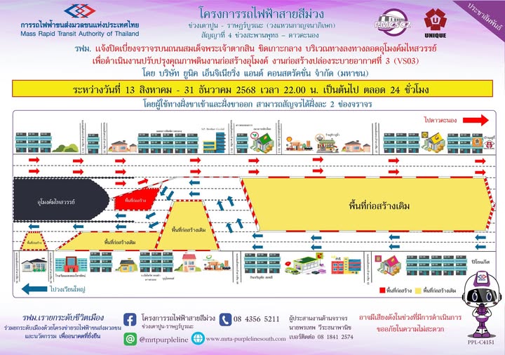 การรถไฟฟ้าขนส่งมวลชนแห่งประเทศไทย (รฟม.) แจ้งว่า บริษัท ยูนิค เอ็นจิเนียริ่ง แอนด์ คอนสตรัคชั่น จำกัด (มหาชน) ผู้รับจ้างงานออกแบบและก่อสร้างอุโมงค์ทางวิ่งและสถานีใต้ดิน โครงการรถไฟฟ้าสายสีม่วง ช่วงเตาปูน - ราษฎร์บูรณะ (วงแหวนกาญจนาภิเษก) สัญญาที่ 4 ช่วงสะพานพุทธ - ดาวคะนอง มีความจำเป็นต้องปิดเบี่ยงจราจรบนถนนสมเด็จพระเจ้าตากสิน ชิดเกาะกลาง บริเวณทางลงทางลอดอุโมงค์มไหสวรรย์ เพื่อดำเนินงานปรับปรุงคุณภาพดินงานก่อสร้างอุโมงค์ งานก่อสร้างปล่องระบายอากาศที่ 3 (VS03) ระหว่างวันที่ 13 สิงหาคม - 31 ธันวาคม 2568 เวลา 22.00 น. เป็นต้นไป ตลอด 24 ชั่วโมง โดยผู้ใช้ทางฝั่งขาเข้าและฝั่งขาออก สามารถสัญจรได้ฝั่งละ 2 ช่องจราจร