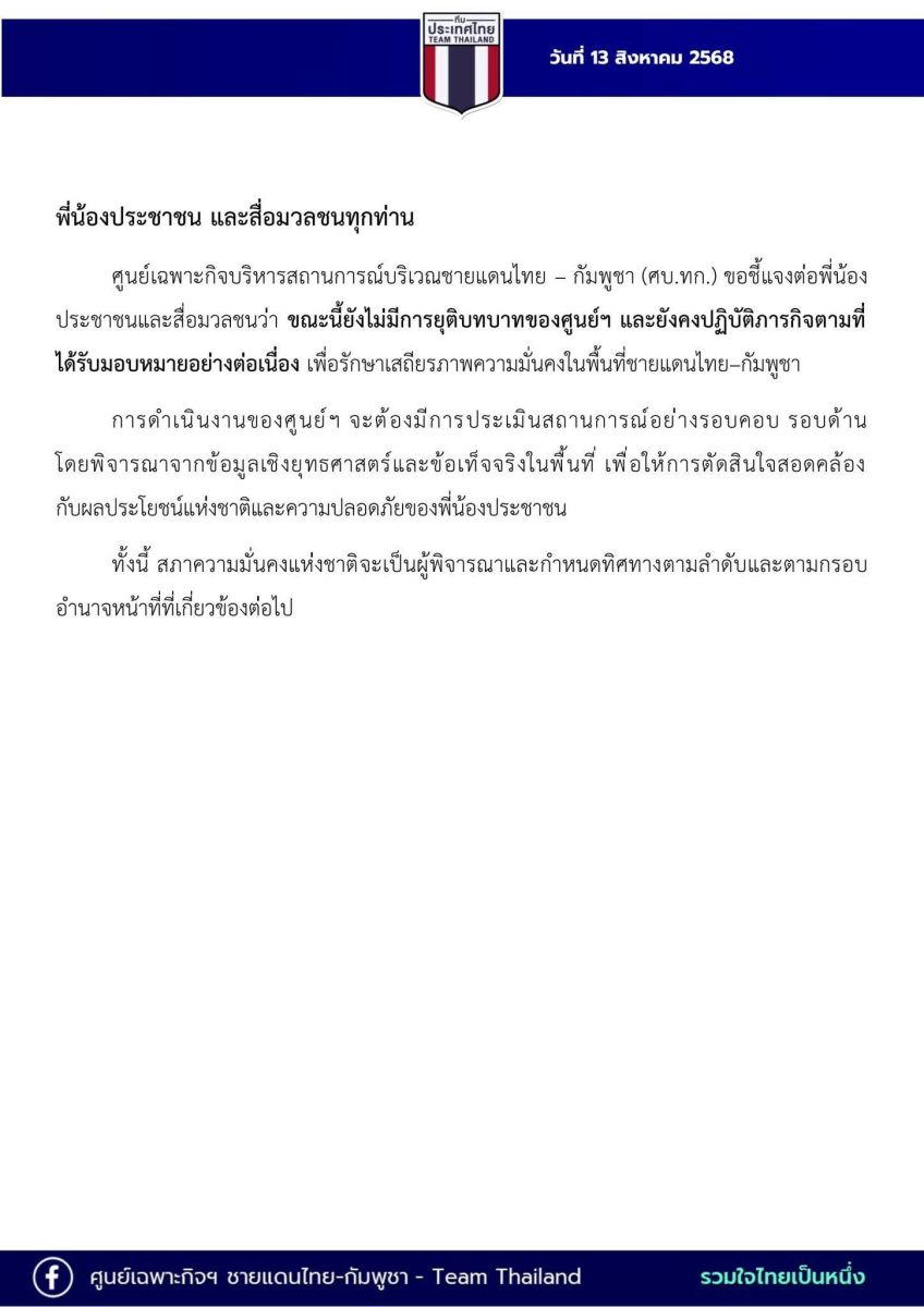 13 ส.ค.68 พี่น้องประชาชน และสื่อมวลชนทุกท่าน ศูนย์เฉพาะกิจบริหารสถานการณ์บริเวณชายแดนไทย – กัมพูชา (ศบ.ทก.) ขอชี้แจงต่อพี่น้องประชาชนและสื่อมวลชนว่า ขณะนี้ยังไม่มีการยุติบทบาทของศูนย์ฯ และยังคงปฏิบัติภารกิจตามที่ได้รับมอบหมายอย่างต่อเนื่อง เพื่อรักษาเสถียรภาพความมั่นคงในพื้นที่ชายแดนไทย–กัมพูชา