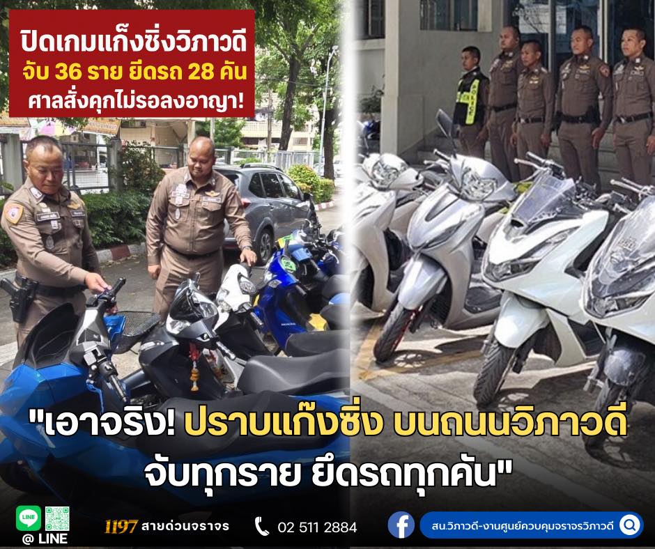 เมื่อวันที่ 15 มิถุนายน 2568 เวลา 01.56 น. เจ้าหน้าที่ตำรวจได้รับแจ้งว่ามีกลุ่มวัยรุ่นรวมตัวในปั๊มน้ำมันบนถนนวิภาวดีรังสิตก่อนขับขี่รถจักรยานยนต์ด้วยความเร็วสูงและในลักษณะไม่ปลอดภัย ก่อความเดือดร้อนรำคาญแก่ผู้ใช้เส้นทาง เจ้าหน้าที่ได้สืบสวน ตรวจสอบภาพจากกล้องวงจรปิดและพยานหลักฐาน จนสามารถระบุตัวผู้กระทำผิด และในวันที่ 20 มิถุนายน 2568 ได้จับกุมผู้ต้องหา 19 ราย แบ่งเป็นผู้ใหญ่ 3 ราย และเยาวชน 16 ราย พร้อมยึดรถจักรยานยนต์ของกลาง 13 คัน ซึ่งศาลได้มีคำพิพากษาแล้ว