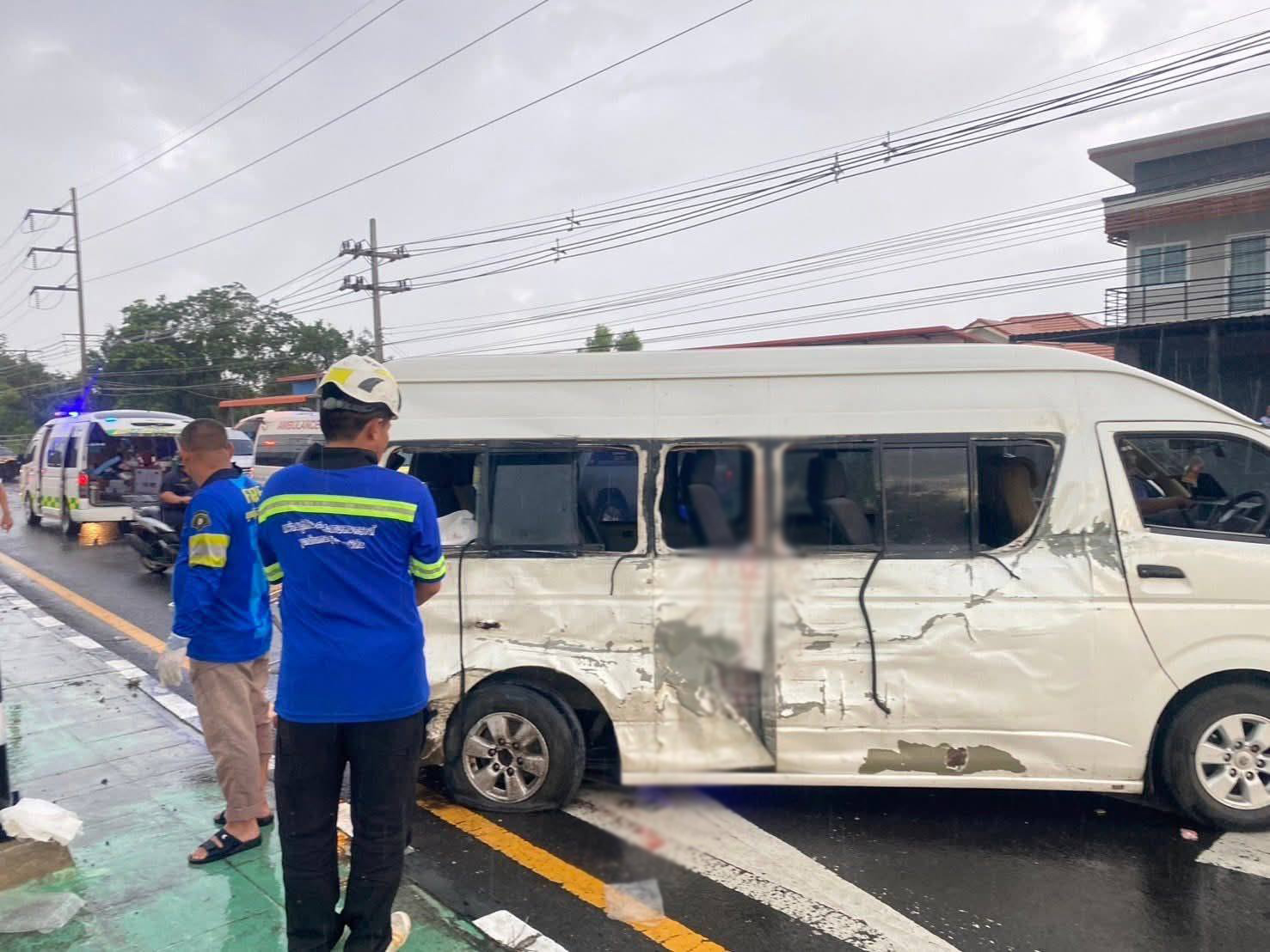 และห่างออกไป พบรถตู้รับ-ส่งนักเรียน ยี่ห้อโตโยต้า สีขาว ป้ายทะเบียน ศรีสะเกษ สภาพข้างรถฝั่งขวา มีร่องรอยการชนได้รับความเสียหาย ตรวจสอบ พบว่า มีผู้ได้รับบาดเจ็บ 11 รายทางอาสาสมัครกู้ชีพ - กู้ภัยให้การช่วยเหลือและนำส่งโรงพยาบาลอุทุมพรพิสัย และพบว่าในที่เกิดเหตุ มีผู้เสียชีวิต 2 ราย เป็นเด็กชาย อายุ 9 ขวบ และเด็กหญิง อายุ 13 ปี