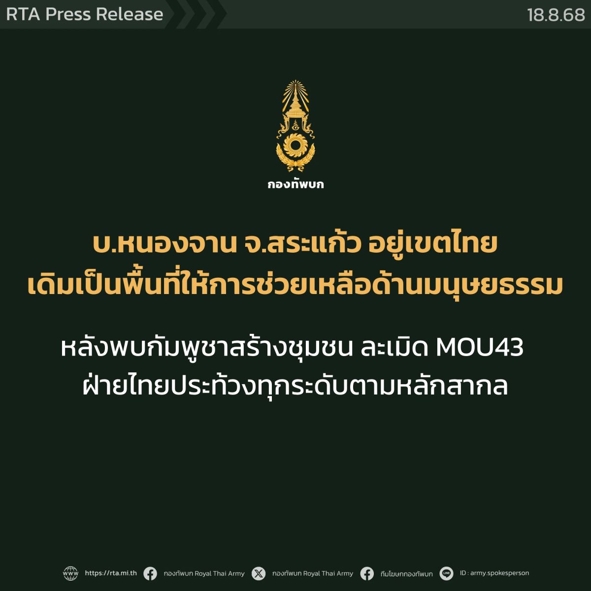 18 สิงหาคม 2568 จากกรณีที่มีชาวกัมพูชาได้ออกมาร้องเรียนเรื่องการวางรั้วลวดหนามของทหารไทยบริเวณบ้านหนองจาน จ.สระแก้ว โดยกล่าวอ้างว่าพื้นที่ดังกล่าวเป็นดินแดนของตนนั้น พลตรี วินธัย สุวารี โฆษกกองทัพบก เปิดเผยว่าแท้จริงแล้วพื้นที่ดังกล่าวเป็นอาณาเขตของประเทศไทย ซึ่งอยู่บริเวณบ.หนองจาน ต.โนนหมากมุ่น อ.โคกสูง จ.สระแก้ว รอยต่อแนวชายแดนไทย-กัมพูชา ระหว่างหลักเขตแดนที่ 46 และ 47