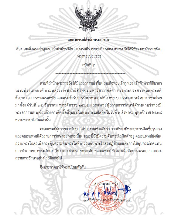 ตามที่สำนักพระราชวัง ได้มีแถลงการณ์ เรื่อง สมเด็จพระเจ้าลูกเธอ เจ้าฟ้าพัชรกิติยาภา นเรนทิราเทพยวดี กรมหลวงราชสาริณีสิริพัชร มหาวัชรราชธิดา ทรงพระประชวรหมดพระสติ ด้วยพระอาการทางพระหทัย และทรงเข้ารับการรักษาพระองค์ที่โรงพยาบาลจุฬาลงกรณ์ สภากาชาดไทย มาตั้งแต่ วันที่ ๑๕ ธันวาคม พุทธศักราช ๒๕๖๕ และแพทย์ผู้ถวายการรักษาได้รายงานว่าทรงมี พระอาการแทรกซ้อนด้วยการติดเชื้อที่รุนแรงในพระกระแสโลหิต ในวันที่ ๙ สิงหาคม พุทธศักราช ๒๕๖๘ ความทราบทั่วกันแล้วนั้น