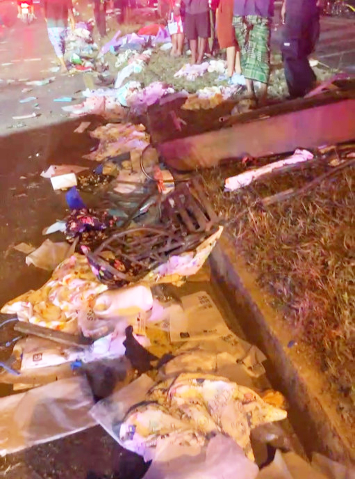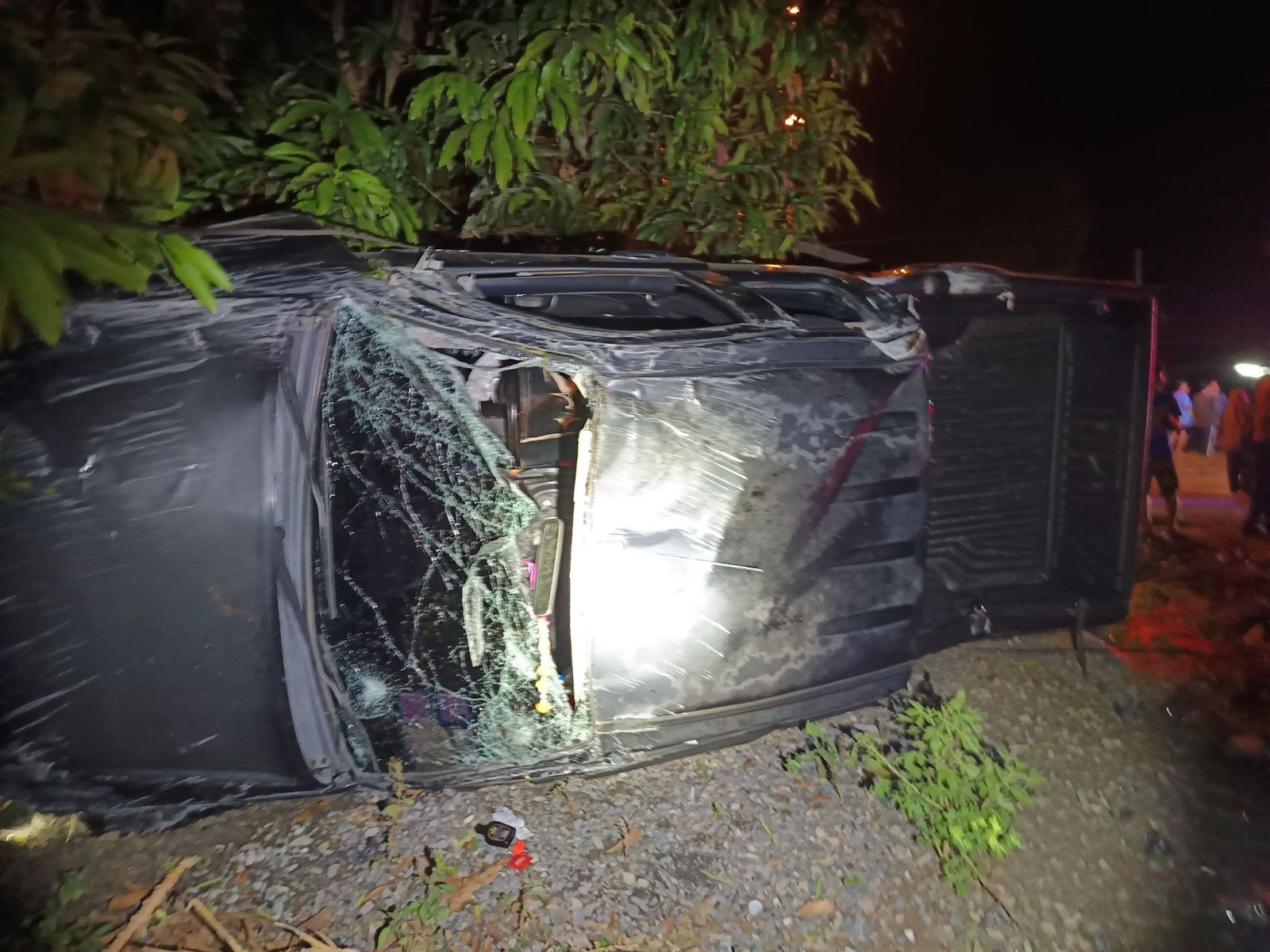 ที่เกิดเหตุ พบรถกระบะ อีซูซุ สีเทา สภาพหน้ารถพังเสียหายอยู่บนเกาะกลาง, รถจักรยานยนต์พ่วงข้าง ไม่ทราบยี่ห้อ ป้ายทะเบียน นครศรีธรรมราช สภาพพังทั้งคันอยู่ในพงหญ้า และรถกระบะ อีซูซุ สีดำ สภาพพลิกตะแคงอยู่ข้างทาง