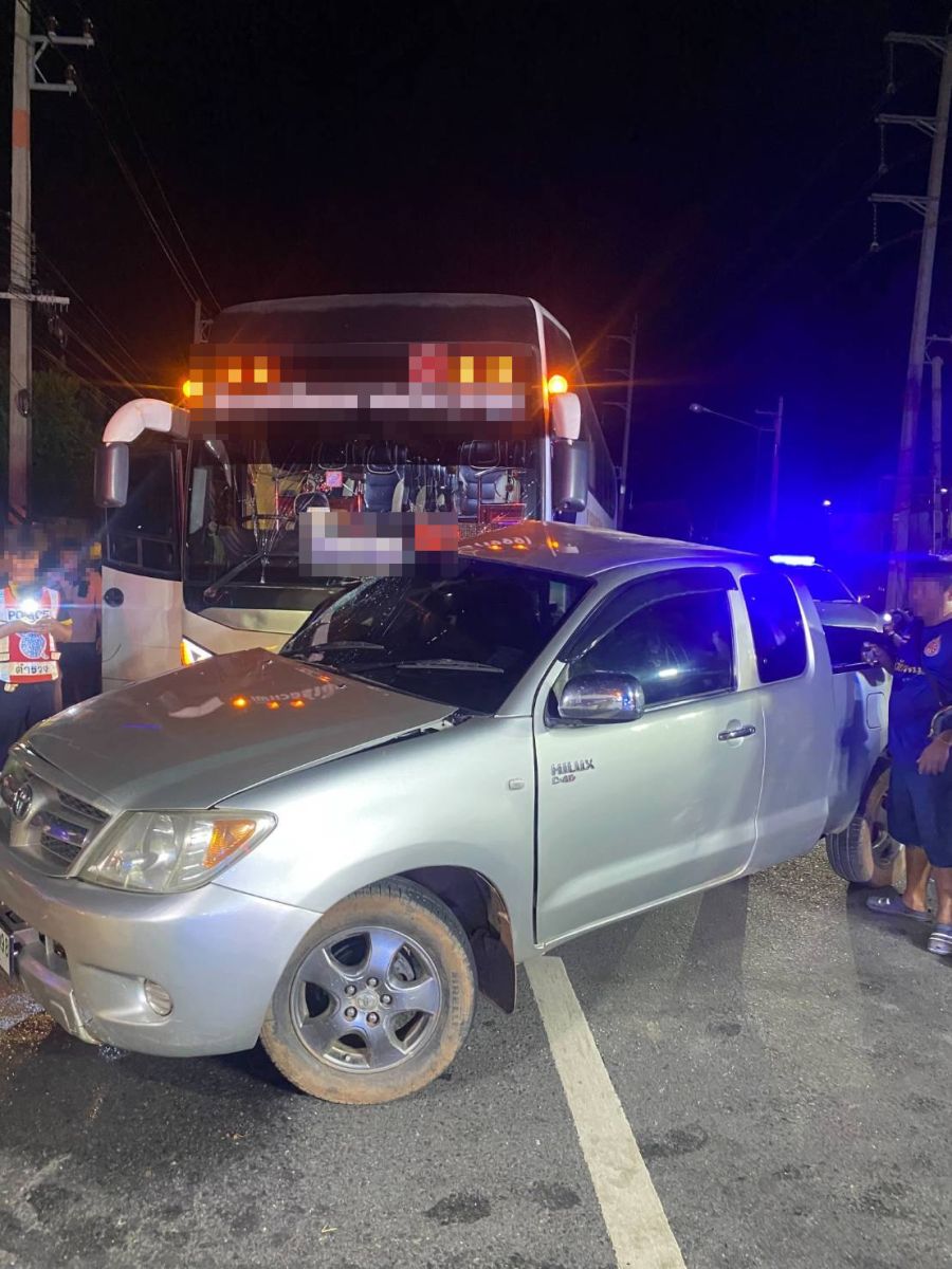 รถบัสรับ-ส่งพนักงาน ชนกับรถกระบะ กลางถนนสายตลาดบางบ่อ - แยกบางคล้า คุณลุงขับกระบะเสียชีวิต จ.ฉะเชิงเทรา