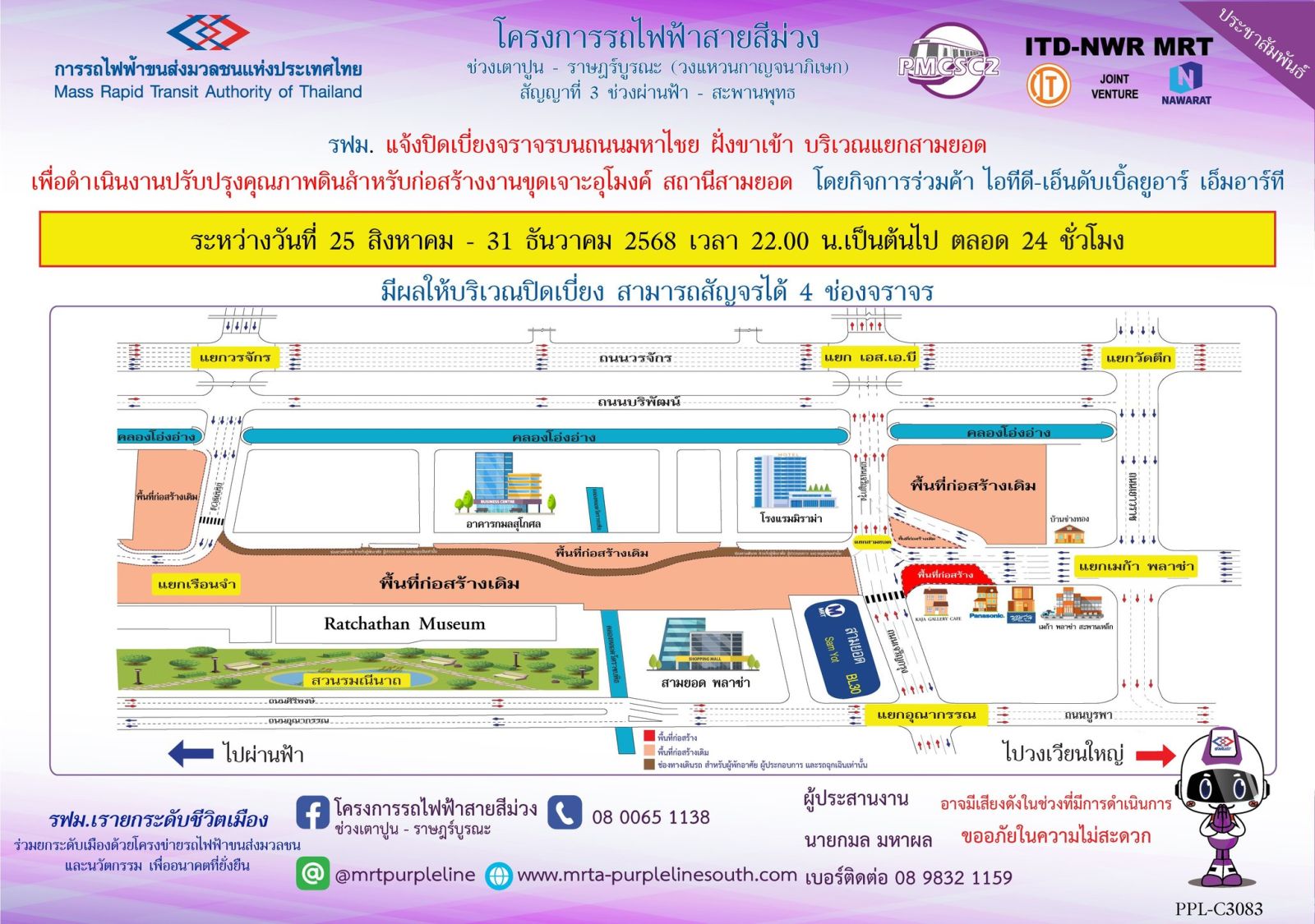 การรถไฟฟ้าขนส่งมวลชนแห่งประเทศไทย (รฟม.) แจ้งว่า กิจการร่วมค้า ไอทีดี-เอ็นดับเบิ้ลยูอาร์ เอ็มอาร์ที ผู้รับจ้างงานออกแบบและก่อสร้างอุโมงค์ทางวิ่งและสถานีใต้ดิน โครงการรถไฟฟ้าสายสีม่วง ช่วงเตาปูน – ราษฎร์บูรณะ (วงแหวนกาญจนาภิเษก) สัญญาที่ 3 ช่วงผ่านฟ้า - สะพานพุทธ มีความจำเป็นต้องปิดเบี่ยงจราจรบนถนนมหาไชย ฝั่งขาเข้า บริเวณแยกสามยอด เพื่อดำเนินงานปรับปรุงคุณภาพดินสำหรับก่อสร้างงานขุดเจาะอุโมงค์ สถานีสามยอด ระหว่างวันที่ 25 สิงหาคม - 31 ธันวาคม 2568 เวลา 22.00 น. เป็นต้นไป ตลอด 24 ชั่วโมง มีผลให้บริเวณปิดเบี่ยง สามารถสัญจรได้ 4 ช่องจราจร