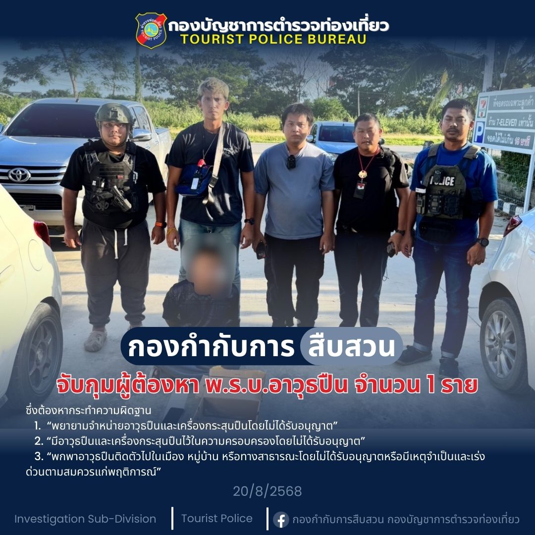 22 ส.ค.68 กองบัญชาการตำรวจท่องเที่ยวภายใต้การอำนวยการของ พล.ต.ท.ศักย์ศิรา เผือกอ่ำ ผบช.ทท. สั่งการให้ พ.ต.ท.กฤตพร แสงสุระ สว.กก.สืบสวน บช.ทท. พร้อมด้วยเจ้าหน้าที่ตำรวจชุดสืบสวนกองบัญชาการตำรวจท่องเที่ยว ได้ทำการจับกุมผู้ต้อง นายที (นามสมมุติ) อายุ 29 ปี