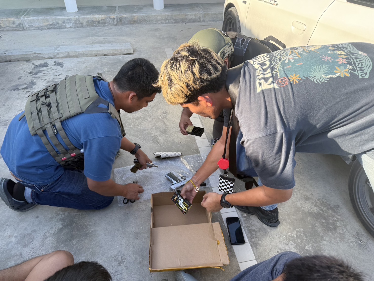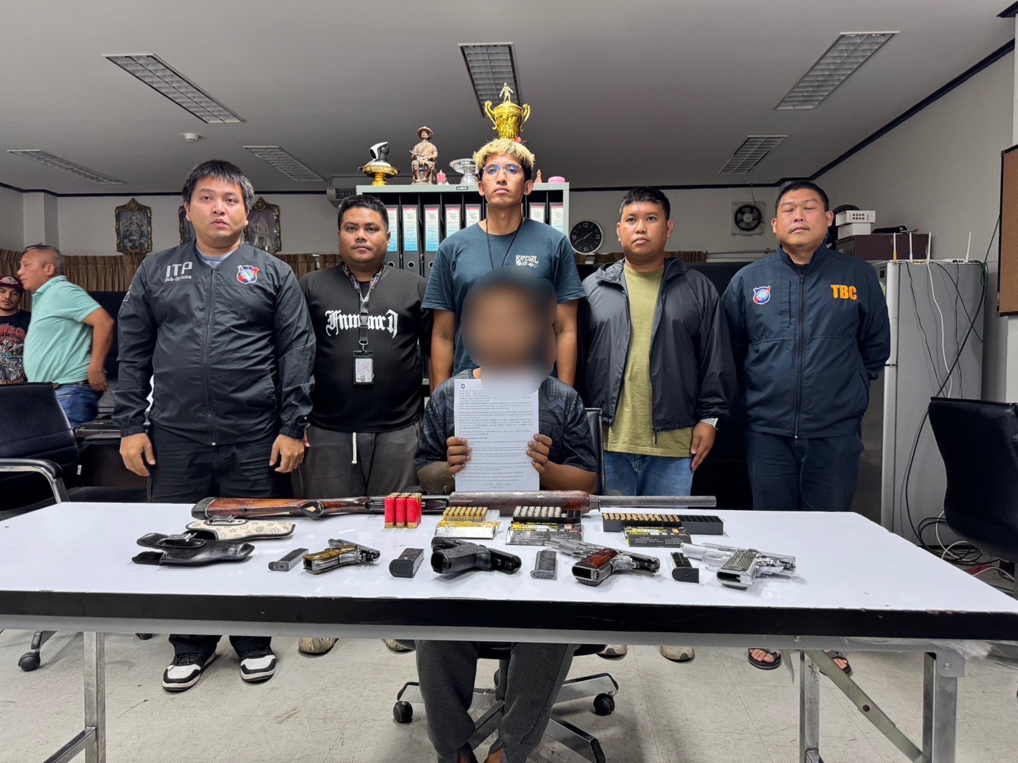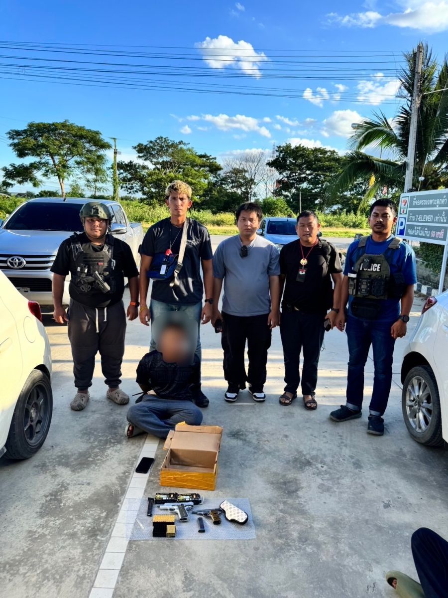 โดยสายลับได้แจ้งตำหนิรูปพรรณกับยานพาหนะให้เจ้าหน้าที่ตำรวจทราบ กระทั่งเวลาประมาณ 17.30 น.ของวันที่ 20 ส.ค. 68 เจ้าหน้าที่ชุดจับกุมได้รับแจ้งจากสายลับว่า นายที (นามสมมุติ) อายุ 29 ปี ได้เดินทางมาที่นัดหมายดังกล่าว โดยใช้รถยนต์สีขาวในการเดินทาง เมื่อผู้ต้องหา เดินทางมาถึงยังจุดส่งพัสดุ สายลับจึงได้ทำการพูดคุยสอบถามถึงอาวุธปืนที่ได้ทำการสั่งซื้อกัน จากนั้นเจ้าหน้าที่ตำรวจชุดจับกุมจึงเข้าไปทำการแสดงตัวและขอทำการตรวจค้น ผลการตรวจบภายในกล่องพัสดุที่นายที (นามสมมุติ) อายุ 29 ปี ถือมาเป็นอาวุธปืนแบลงค์กันไทยประดิษฐ์ ขนาด .380 จำนวน 1 กระบอกพร้อมแม็กกาซีน จำนวน 1 แม็กกาซีน (ถูกบรรจุอยู่ภายในกล่องพัสดุที่กำลังเตรียมจัดส่ง) , อาวุธปืนยี่ห้อ Rama ขนาด .32 จำนวน 1 กระบอก พร้อมแม็กกาซีนจำนวน 1 แม็กกาซีน (ถูกบรรจุอยู่ภายในกล่องพัสดุที่กำลังเตรียมจัดส่ง) ,ซองพกในปืนพกสั้น 2 ซอง และ เครื่องกระสุน ขนาด .32 จำนวน 65 นัด (ถูกบรรจุอยู่ภายในกล่องพัสดุที่กำลังเตรียมจัดส่ง)
