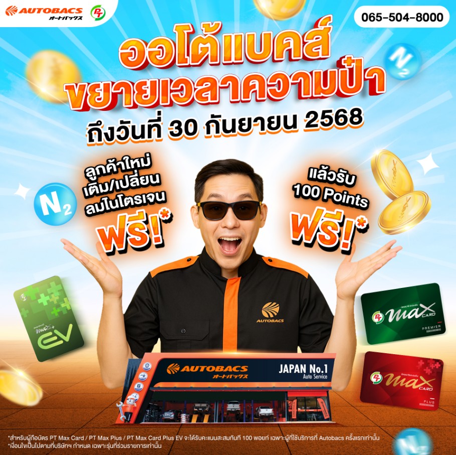2. ลูกค้าใหม่ที่ไม่เคยใช้ออโต้แบคส์ต้องมาเปลี่ยน/เติมลมไนโตรเจน 1 ครั้ง (ไม่มีค่าใช้จ่าย) เพื่อรับฟรี 100 พอยท์ บัตรสมาชิก PT Max Card Premier, PT Max Card Plus และ PT Max Card Plus EV
