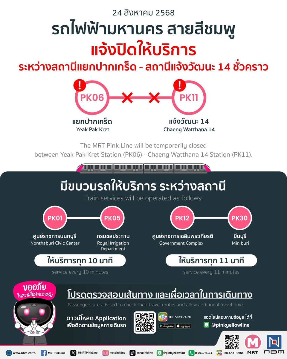 รถไฟฟ้ามหานครสายสีชมพู ปิดให้บริการระหว่าง สถานีแยกปากเกร็ด (PK06) - สถานีแจ้งวัฒนะ 14 (PK11) เป็นการชั่วคราว