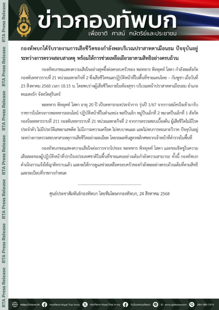 24 สิงหาคม 2568 กองทัพบกขอแสดงความเสียใจอย่างสุดซึ้งต่อครอบครัวของ พลทหาร พิทยุตท์ โสดา กำลังพลสังกัด กองพันทหารราบที่ 21 หน่วยเฉพาะกิจที่ 2 ซึ่งเสียชีวิตขณะปฏิบัติหน้าที่ในพื้นที่ชายแดนไทย – กัมพูชา เมื่อวันที่ 23 สิงหาคม 2568 เวลา 18.15 น. โดยพบร่างผู้เสียชีวิตภายในห้องสุขา บริเวณหน้าปราสาทตาเมือนธม อำเภอพนมดงรัก จังหวัดสุรินทร์