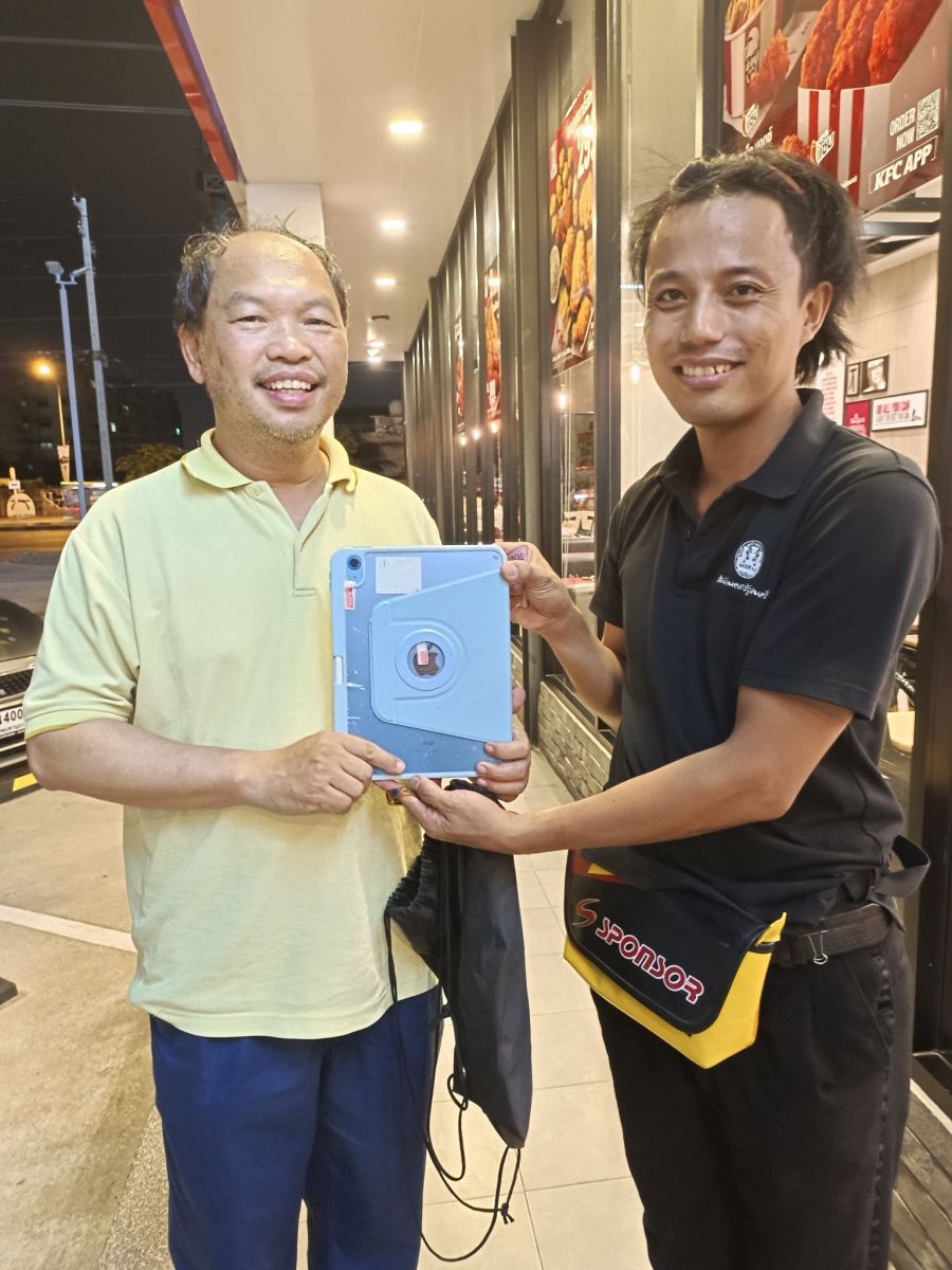 คุณสาโรจน์ จิ๋วทองคำ เก็บของได้เป็นไอแพด 1 เครื่อง สีน้ำเงิน ใส่เคสมีฝาปิดสีฟ้า พร้อมปากกาไอแพด พบหล่นอยู่ที่กลางถนนสุขุมวิท ขาเข้า ช่วงป้ายรถเมล์ หน้าห้างอิมพีเรียลเวิลด์ สำโรง เก็บได้เวลา 07:30 น. วันอาทิตย์ที่ 24 สิงหาคม 2568 ที่ผ่านมา