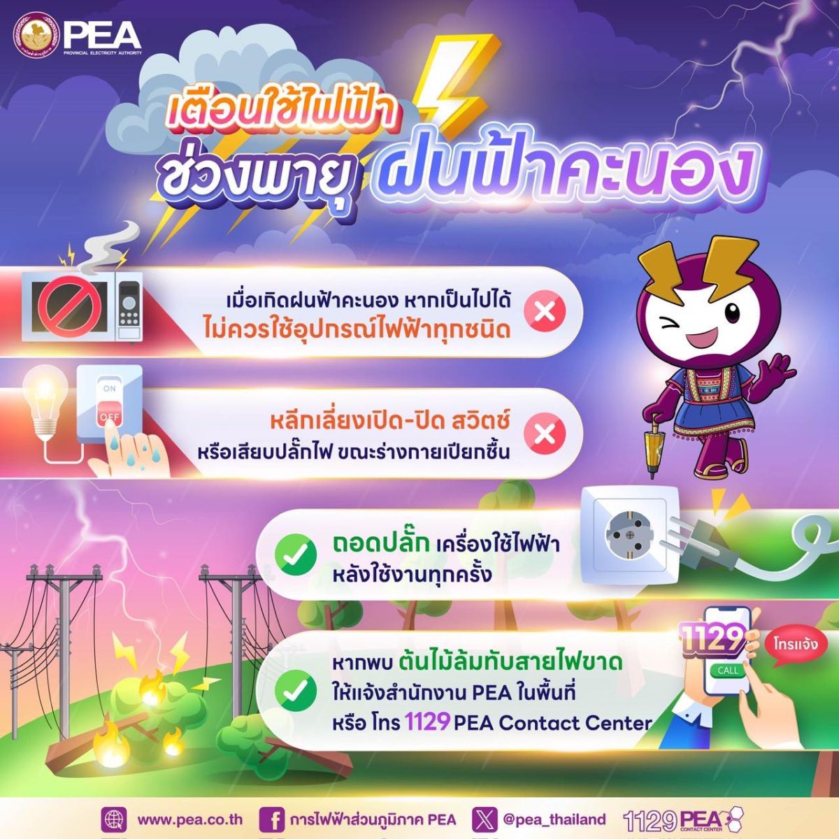 การไฟฟ้าส่วนภูมิภาค (PEA) มีความห่วงใยในความปลอดภัยในชีวิตและทรัพย์สินของประชาชน กรณีเกิดพายุฝนฟ้าคะนองและทำให้เกิดอุบัติภัยทางไฟฟ้าได้ อาทิ กระแสไฟฟ้าขัดข้องจากสาเหตุเสาอากาศ ป้ายโฆษณา ต้นไม้หรือกิ่งไม้ใหญ่ล้มทับสายไฟฟ้าแรงสูงและบ้านเรือนที่พักอาศัย เป็นเหตุให้กระแสไฟฟ้าดับเป็นวงกว้าง หรือเกิดอันตรายต่อชีวิตและทรัพย์สินของประชาชน เพื่อความปลอดภัยจึงขอแจ้งเตือนประชาชนที่อยู่ในพื้นที่เสี่ยง ติดตามสภาวะอากาศจากกรมอุตุนิยมวิทยาอย่างใกล้ชิด หมั่นตรวจสอบอุปกรณ์ไฟฟ้าให้อยู่ในสภาพปกติ ซึ่ง PEA มีข้อแนะนำเพื่อความปลอดภัย ดังนี้