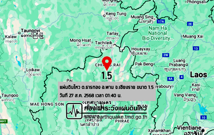 วันที่ 27 ส.ค. 2568 เวลา 01.40 น. กองเฝ้าระวังแผ่นดินไหว กรมอุตุนิยมวิทยา แจ้งเหตุ แผ่นดินไหว ขนาด 1.5 ความลึก 3 กม. ภายในพื้นที่ของ ต.ธารทอง อ.พาน จ.เชียงราย (19.71°N,99.70°E)