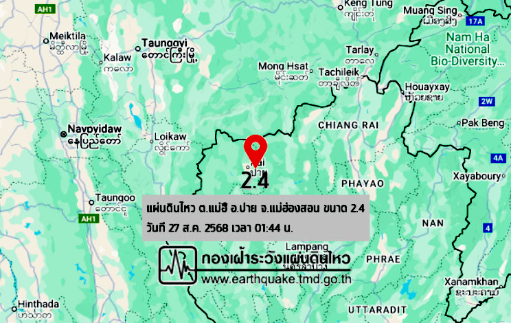 และ เวลา 01.44 น. กองเฝ้าระวังแผ่นดินไหว กรมอุตุนิยมวิทยา แผ่นดินไหว ขนาด 2.4 ความลึก 3 กม. ภายในพื้นที่ของ ต.แม่ฮี้ อ.ปาย จ.แม่ฮ่องสอน (19.34°N,98.54°E)