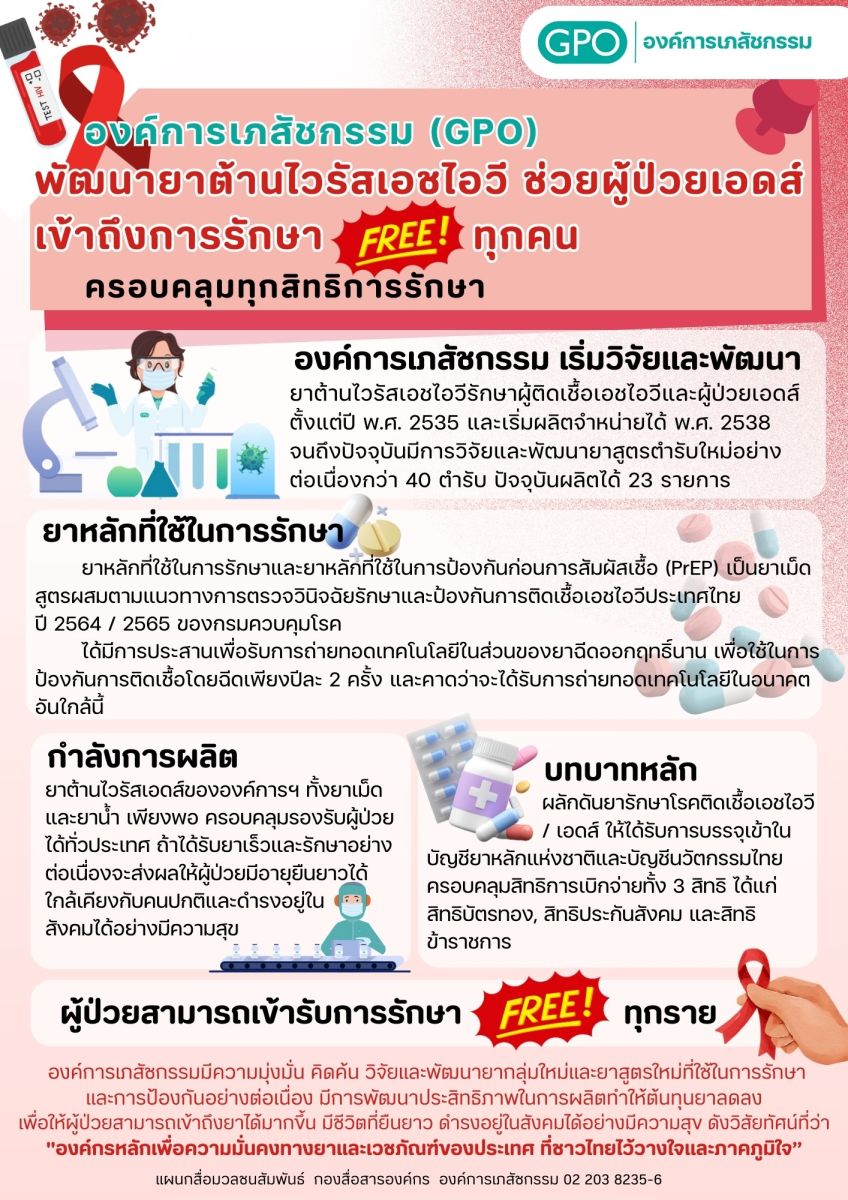 องค์การเภสัชกรรม (GPO) พัฒนายาต้านไวรัสเอชไอวี ช่วยผู้ป่วยเอดส์เข้าถึงการรักษาฟรีทุกคน ครอบคลุมทุกสิทธิการรักษา เพิ่มประสิทธิภาพในการรักษาและการเข้าถึงยาของผู้ป่วย ส่งผลให้ผู้ป่วยมีคุณภาพชีวิตที่ดีขึ้น มีชีวิตที่ยืนยาว ดำรงอยู่ในสังคมได้อย่างมีความสุข