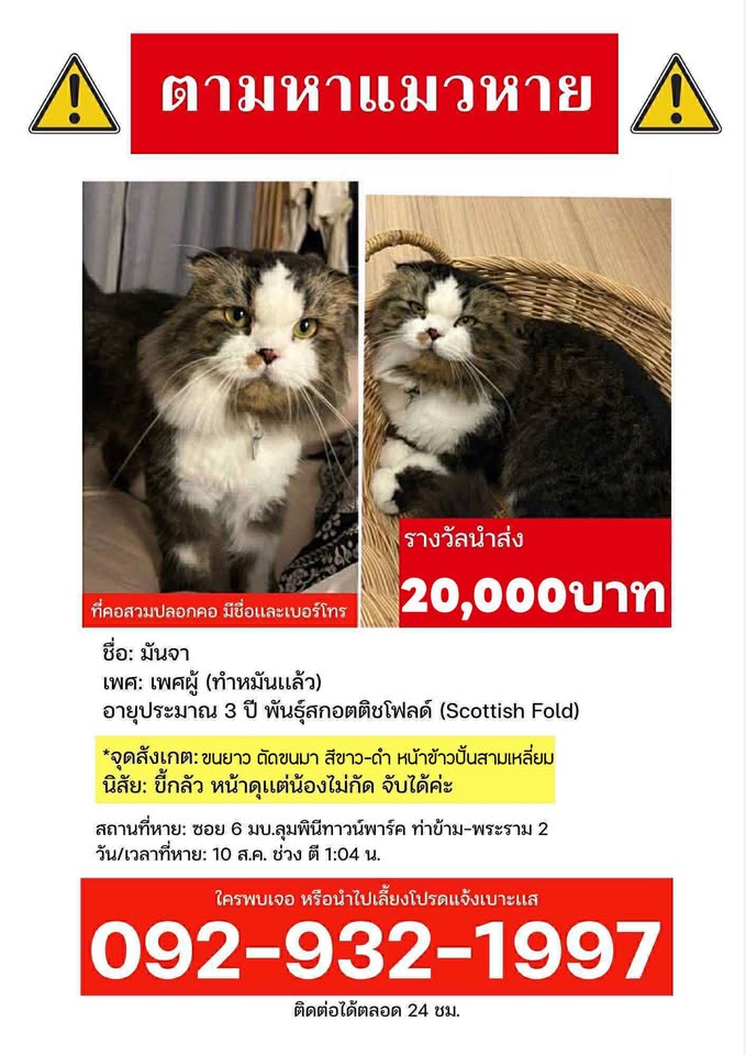 ตามหา "มันจา" แมวเพศผู้ อายุ 3 ปี ลักษณะ ขนยาว สีดำ-ขาว หน้าเป็นรูปสามเหลี่ยม สวมปลอกคอ นิสัย ขี้กลัว หน้าดุแต่ไม่กัด จับได้