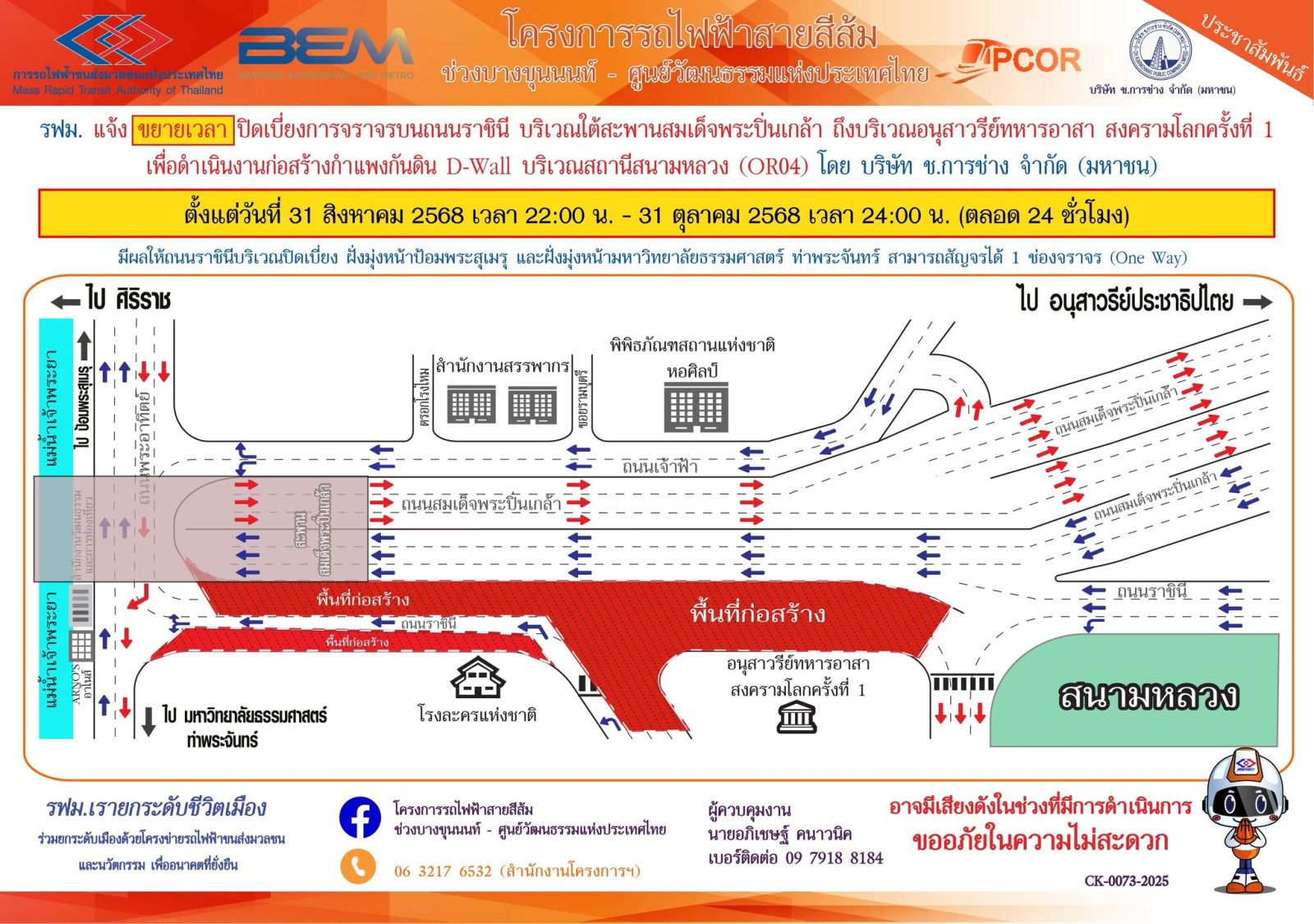 รฟม. แจ้ง ขยายเวลาปิดเบี่ยงการจราจร บนถนนราชินี บริเวณใต้สะพานสมเด็จพระปิ่นเกล้า ถึงบริเวณอนุสาวรีย์ทหารอาสา สงครามโลกครั้งที่ 1 เพื่อดำเนินงานก่อสร้างกำแพงกันดิน D-Wall บริเวณสถานีสนามหลวง (OR04) โครงการรถไฟฟ้าสายสีส้ม ช่วงบางขุนนนท์ - ศูนย์วัฒนธรรมแห่งประเทศไทย ตั้งแต่วันที่ 31 สิงหาคม 2568 เวลา 22:00 น. – 31 ตุลาคม 2568 เวลา 24:00 น. (ตลอด 24 ชั่วโมง)