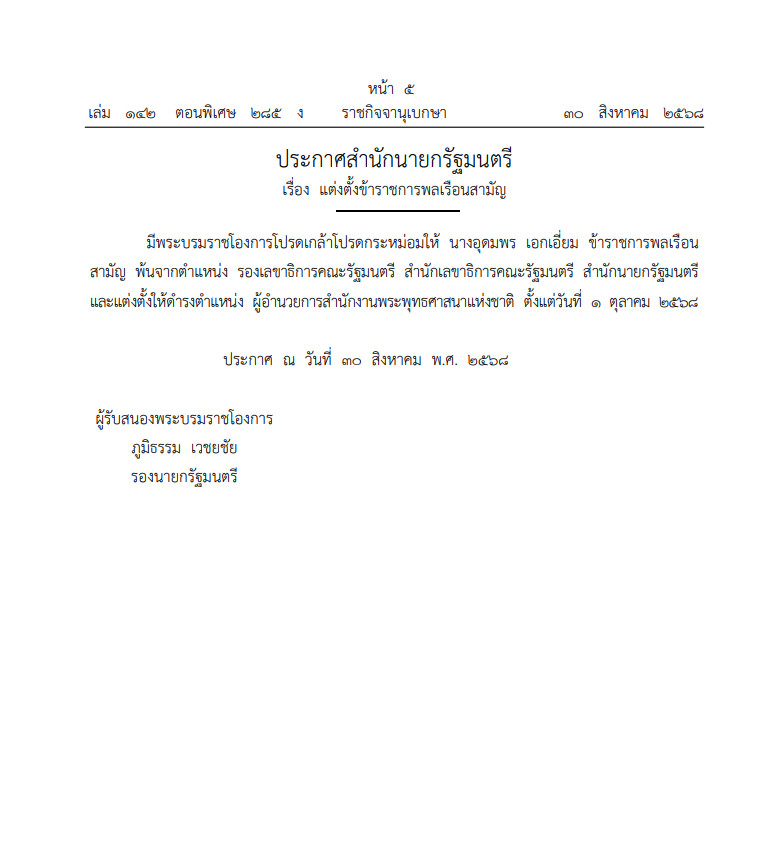 วันที่ 30 สิงหาคม 2568 เว็บไซต์ราชกิจจานุเบกษา เผยแพร่ประกาศสำนักนายกรัฐมนตรี เรื่อง "แต่งตั้งข้าราชการพลเรือนสามัญ" โดยระบุว่า มีพระบรมราชโองการโปรดเกล้าโปรดกระหม่อมให้นางอุดมพร เอกเอี่ยม ข้าราชการพลเรือนสามัญ พ้นจากตำแหน่งรองเลขาธิการคณะรัฐมนตรี สำนักเลขาธิการคณะรัฐมนตรี สำนักนายกรัฐมนตรีและแต่งตั้งให้ดำรงตำแหน่งผู้อำนวยการสำนักงานพระพุทธศาสนาแห่งชาติ ตั้งแต่วันที่ 1 ตุลาคม 2568