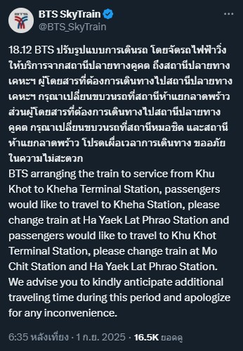 1 ก.ย. 68 เวลา 18.12 น. BTS ปรับรูปแบบการเดินรถ โดยจัดรถไฟฟ้าวิ่งให้บริการจากสถานีปลายทางคูคต ถึงสถานีปลายทางเคหะฯ ผู้โดยสารที่ต้องการเดินทางไปสถานีปลายทางเคหะฯ กรุณาเปลี่ยนขบวนรถที่สถานีห้าแยกลาดพร้าว