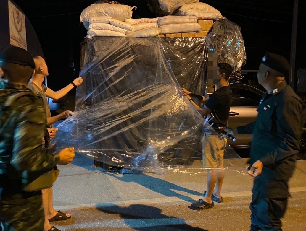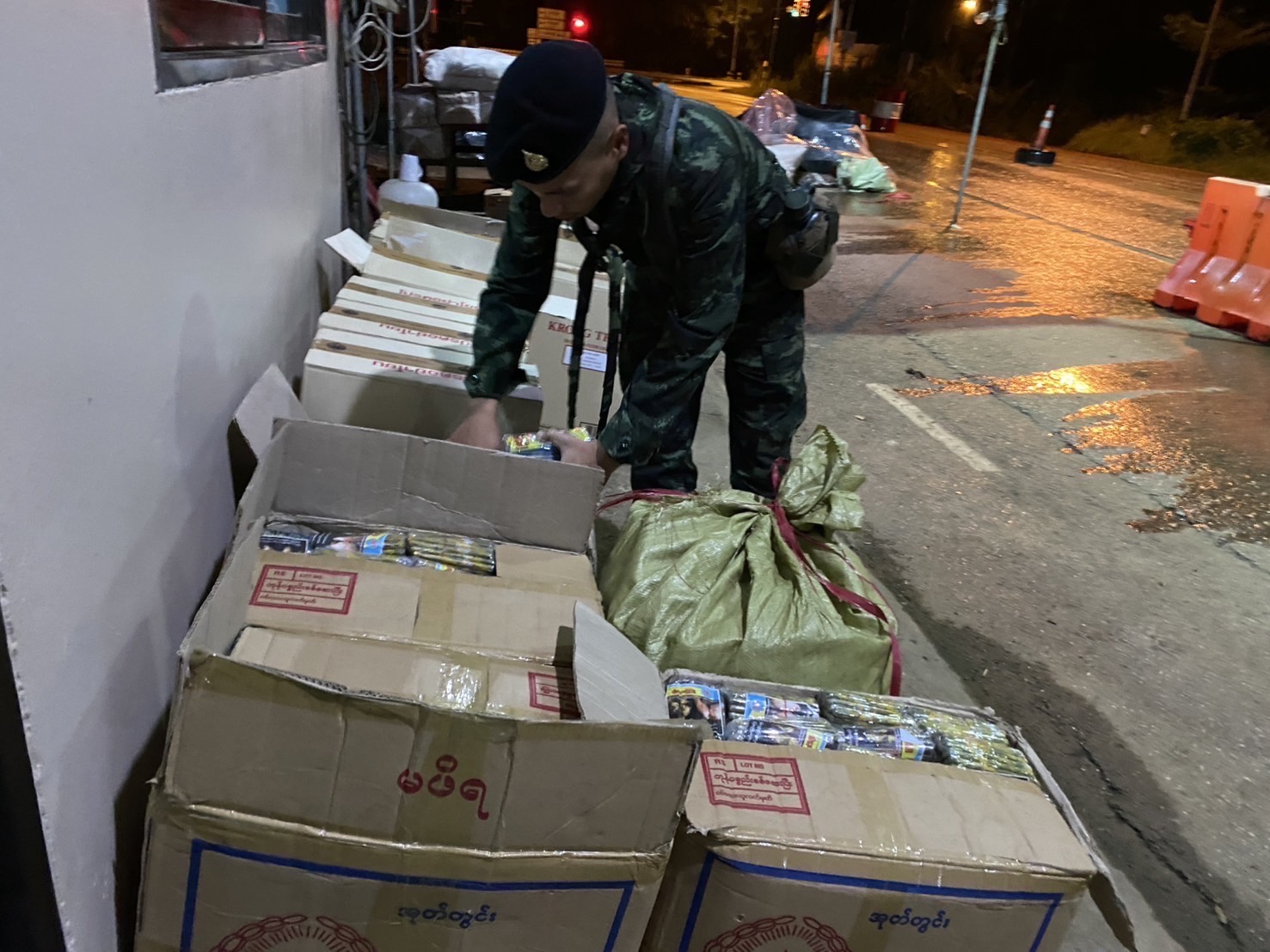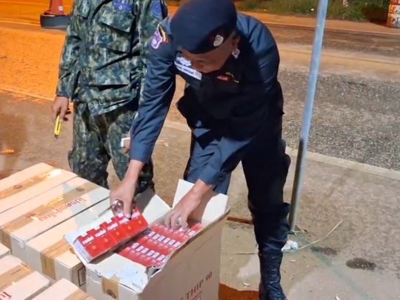 กระทั่งเวลา 00.30 น. ขณะที่เจ้าหน้าที่ฝ่ายความมั่นคงกำลังร่วมกันตั้งจุดตรวจจุดสกัด บริเวณ จุดตรวจร่วมสามแยกทองผาภูมิ บ้านท่าขนุน ต.ท่าขนุน อ.ทองผาภูมิ จ.กาญจนบุรี สังเกตพบรถยนต์กระบะลักษณะตามที่ได้รับแจ้งจากสายข่าว ขับมาจาก อ.สังขละบุรี มุ่งหน้า อ.เมืองกาญจนบุรี จึงได้ให้สัญญาณหยุดรถและแสดงตนเป็นเจ้าหน้าที่เพื่อทำการตรวจสอบ พบชาย อายุ 33 ปี เป็นผู้ขับขี่รถยนต์กระบะ หมวดจังหวัดพระนครศรีอยุธยา ขณะพูดคุยสอบถามเจ้าหน้าที่สังเกตพบอาการพิรุธชัดเจน และสังเกตพบว่าบริเวณด้านหลังกระบะคอกมีผ้าใบคลุมสิ่งของบางอย่างไว้ จึงได้ทำการตรวจสอบอย่างละเอียด พบบุหรี่หนีภาษี ยี่ห้อกรองทิพย์ จำนวน 450 คอตตอน และบุหรี่เมียนมา ยี่ห้อไชโย จำนวน 200 ห่อ บรรจุในลังกระดาษซุกซ่อนอยู่บริเวณด้านท้ายกระบะคอก ซึ่งเปรียบเทียบราคาค่าปรับของสรรพสามิต เป็นเงินกว่า 4 ล้านบาท