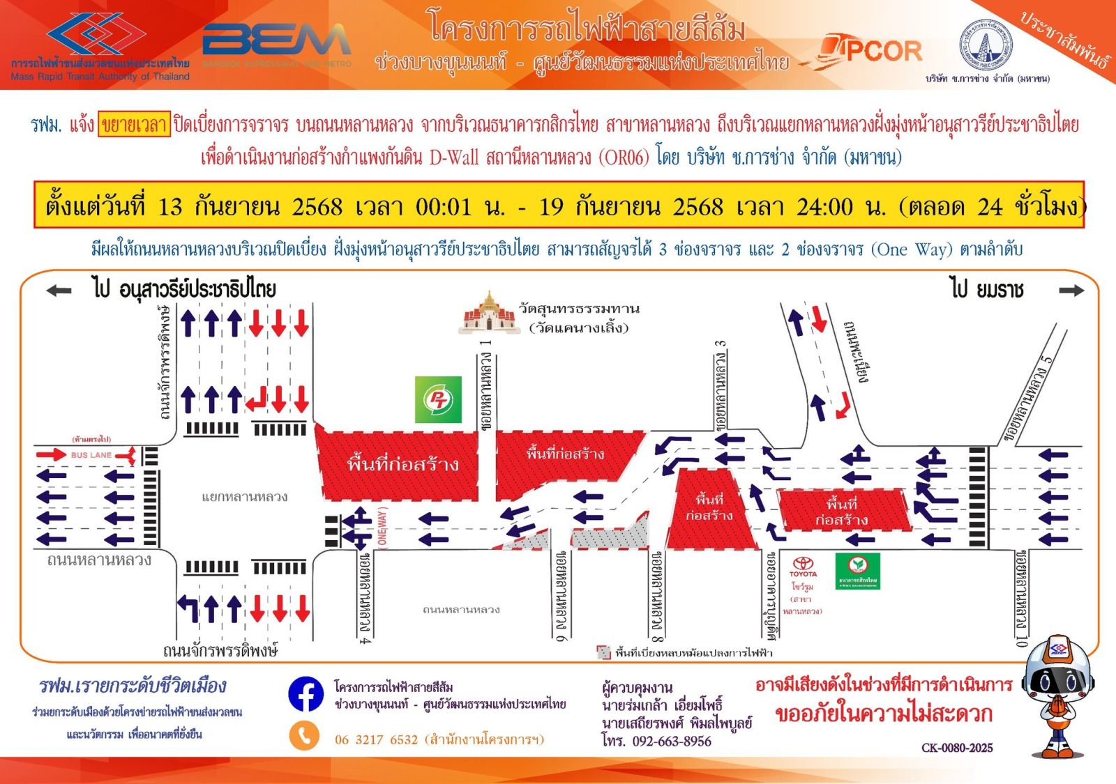 เพื่อดำเนินงานก่อสร้างกำแพงกันดิน D-Wall สถานีหลานหลวง (OR06) โครงการรถไฟฟ้าสายสีส้ม ช่วงบางขุนนนท์ - ศูนย์วัฒนธรรมแห่งประเทศไทย ตั้งแต่วันที่ 13 กันยายน 2568 เวลา 00.01 น. – 19 กันยายน 2568 เวลา 24.00 น. (ตลอด 24 ชั่วโมง)