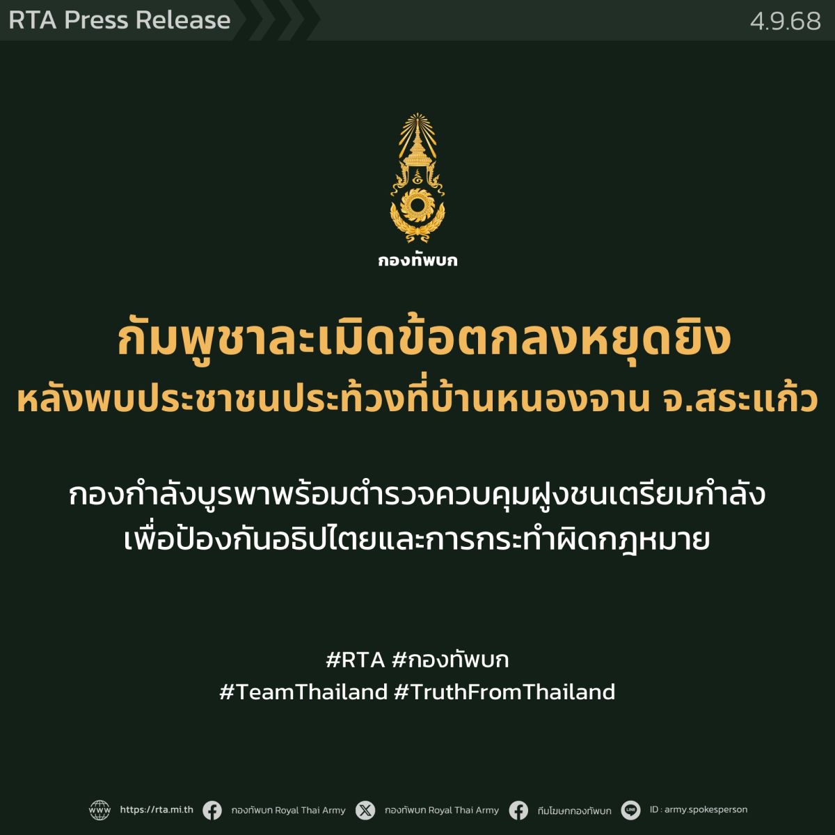 รวมทั้งโฆษกกองทัพบกได้ย้ำว่า ขอให้กัมพูชายึดถือและปฏิบัติตามข้อระเบียบต่างๆ ที่กำหนด ทั้งที่เคยได้ให้ไว้ร่วมกัน และที่เป็นสมาชิกภาคีในอนุสัญญาต่างๆ ในระดับสากล ซึ่งกองทัพบก โดยกองทัพภาคที่ 1 ยืนยันถึงความพร้อมในการปฏิบัติภารกิจ หากตรวจพบการกระทำผิดของประชาชนชาวกัมพูชา ภายใต้ขอบเขตอำนาจหน้าที่ที่มีอยู่ เพื่อดำรงไว้ซึ่งอธิปไตยของชาติ ไม่ให้มีใครมารุกราน ตลอดจนดูแลความปลอดภัยของพี่น้องประชาชนชาวไทยตามแนวชายแดนอย่างเต็มกำลังความสามารถ