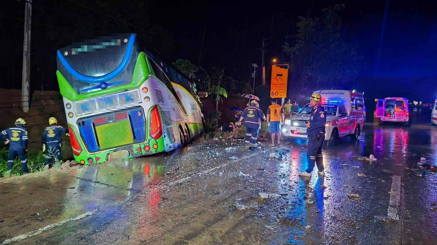 รถบัสชนกับรถพ่วง แล้วเสียหลักตกข้างทาง ริมถนนหมายเลข 304 มีผู้บาดเจ็บหลายราย จ.ฉะเชิงเทรา