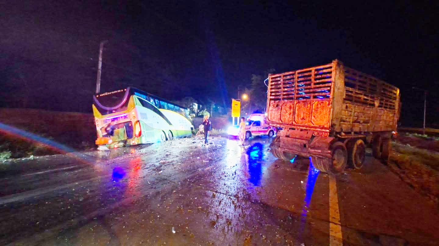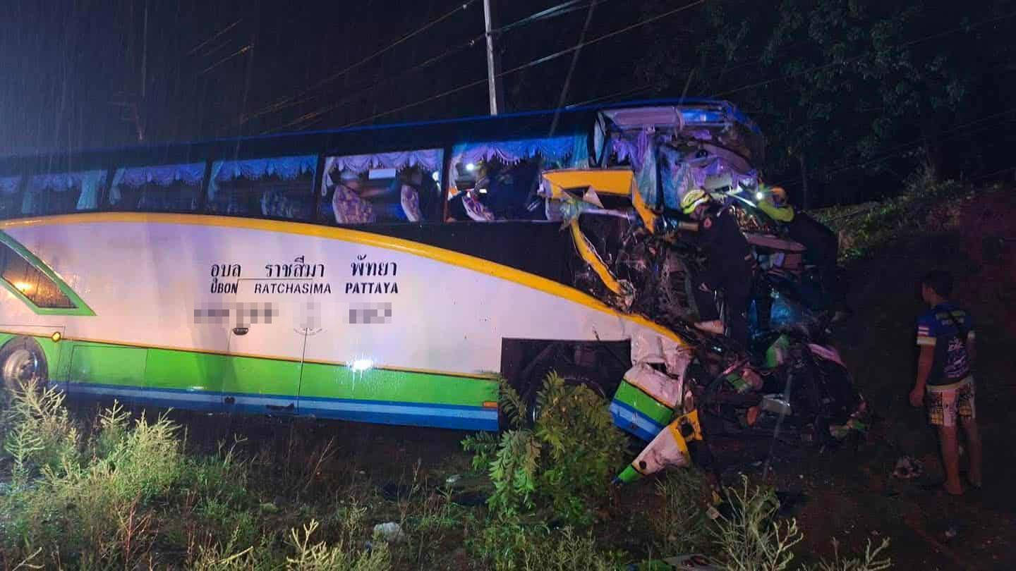 ที่เกิดเหตุ พบรถบัส สาย อุบล นครราชสีมา พัทยา สีขาว-เขียว ลักษณะชนกับ รถพ่วง สีเขียว ป้ายทะเบียน 1478 เจ้าหน้าที่และอาสาสมัครตรวจสอบเบื้องต้น มีผู้ได้รับบาดเจ็บ จำนวน 18 ราย