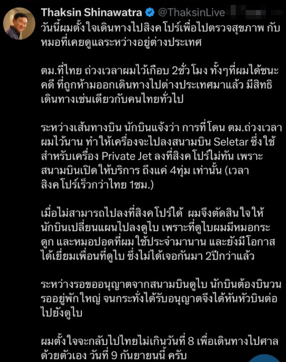 กรณีนายทักษิณ ชินวัตร อดีตนายกรัฐมนตรีปรากฏตัวที่ M jet ดอนเมือง จะ เดินทางออกนอกประเทศ โดยมีปลายทางที่สิงคโปร์ แต่ต่อมามีรายงานว่าเครื่องบินลำดังกล่าวลงจอดที่ประเทศดูไบนั้น เมื่อเวลา 02.07 น. วันที่ 5 ก.ย. 68 ที่ผ่านมา นายทักษิณ ชินวัตร โพสต์ผ่าน x ระบุ