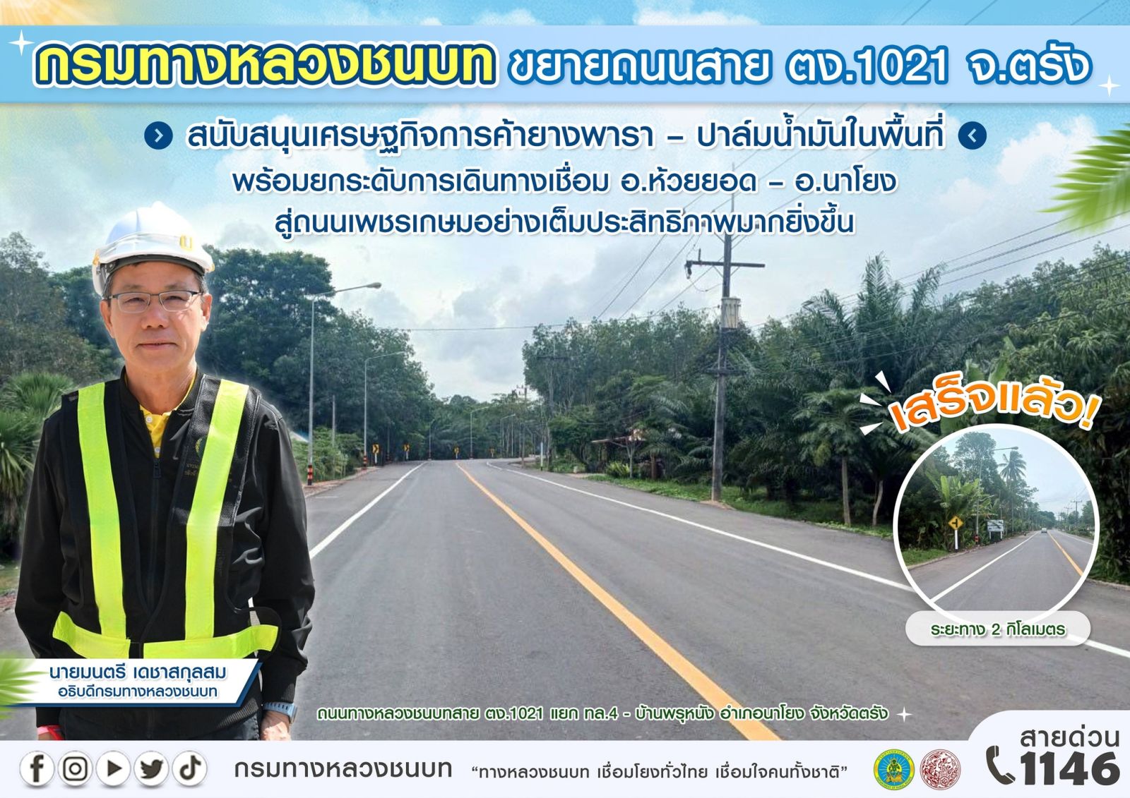 เสร็จแล้ว! กรมทางหลวงชนบท ขยายถนนสาย ตง.1021 จ.ตรัง สนับสนุนเศรษฐกิจการค้ายางพารา – ปาล์มน้ำมันในพื้นที่ พร้อมยกระดับการเดินทางเชื่อม อ.ห้วยยอด – อ.นาโยง สู่ถนนเพชรเกษมอย่างเต็มประสิทธิภาพมากยิ่งขึ้น