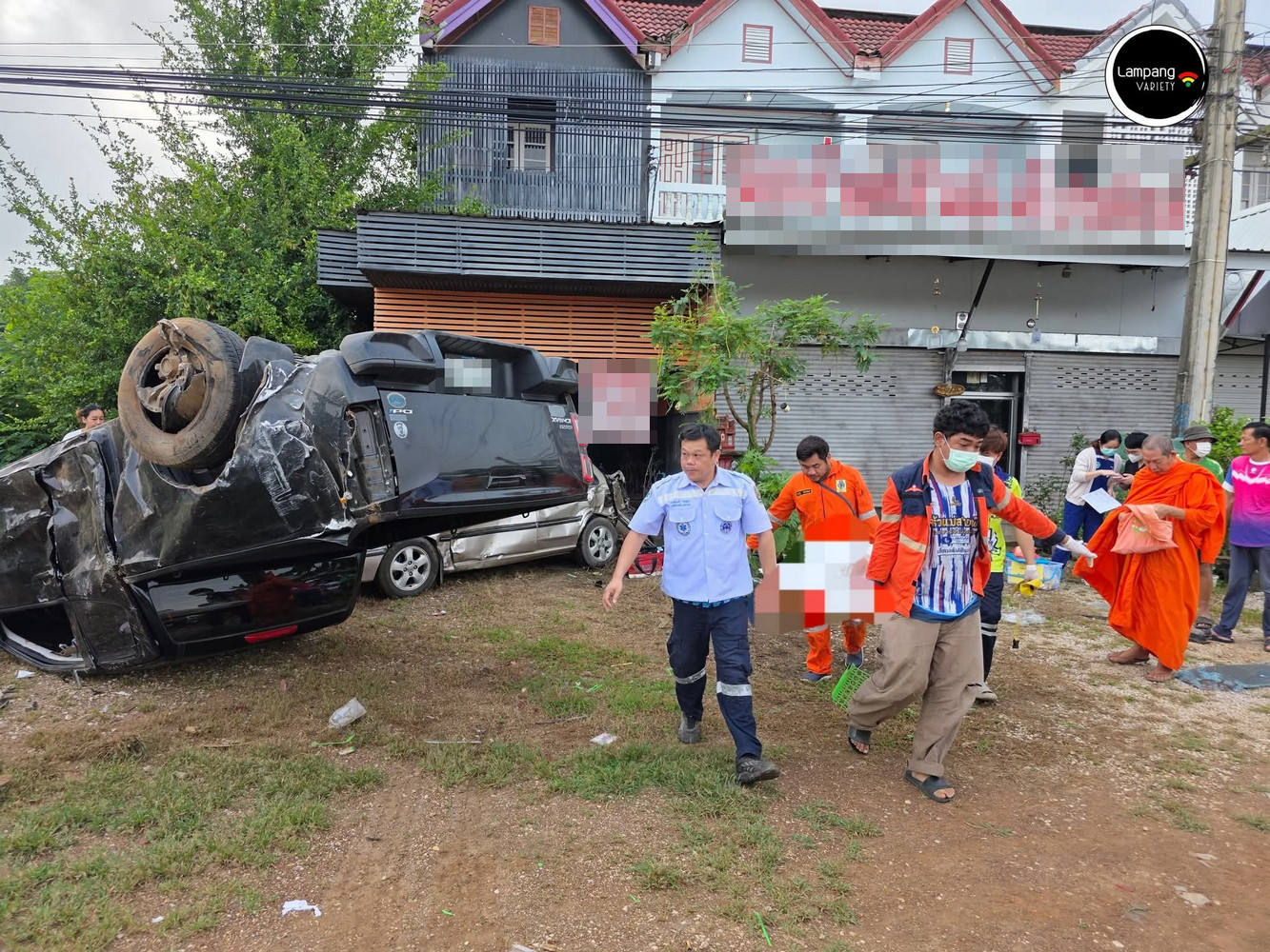 ที่เกิดเหตุ พบรถยนต์กระบะ อีซูซุ ดีแม็กซ์ สีดำ ป้ายทะเบียน ลำปาง ลักษณะพลิกหงายท้องล้อชี้ฟ้า สภาพรถพังยับเสียหายทั้งคัน ข้างๆกั น พบรถยนต์เก๋งรุ่นเก่า สีทอง ทะเบียนลำปาง แถบซ้ายทั้งแถบพังเสียหาย และท้ายรถเก๋งยังกระเด็นไปชนติดกับรถกระบะแวนรุ่นเก่า สีน้ำเงิน ที่จอดอยู่ในบ้าน เสียหายอีก 1 คัน