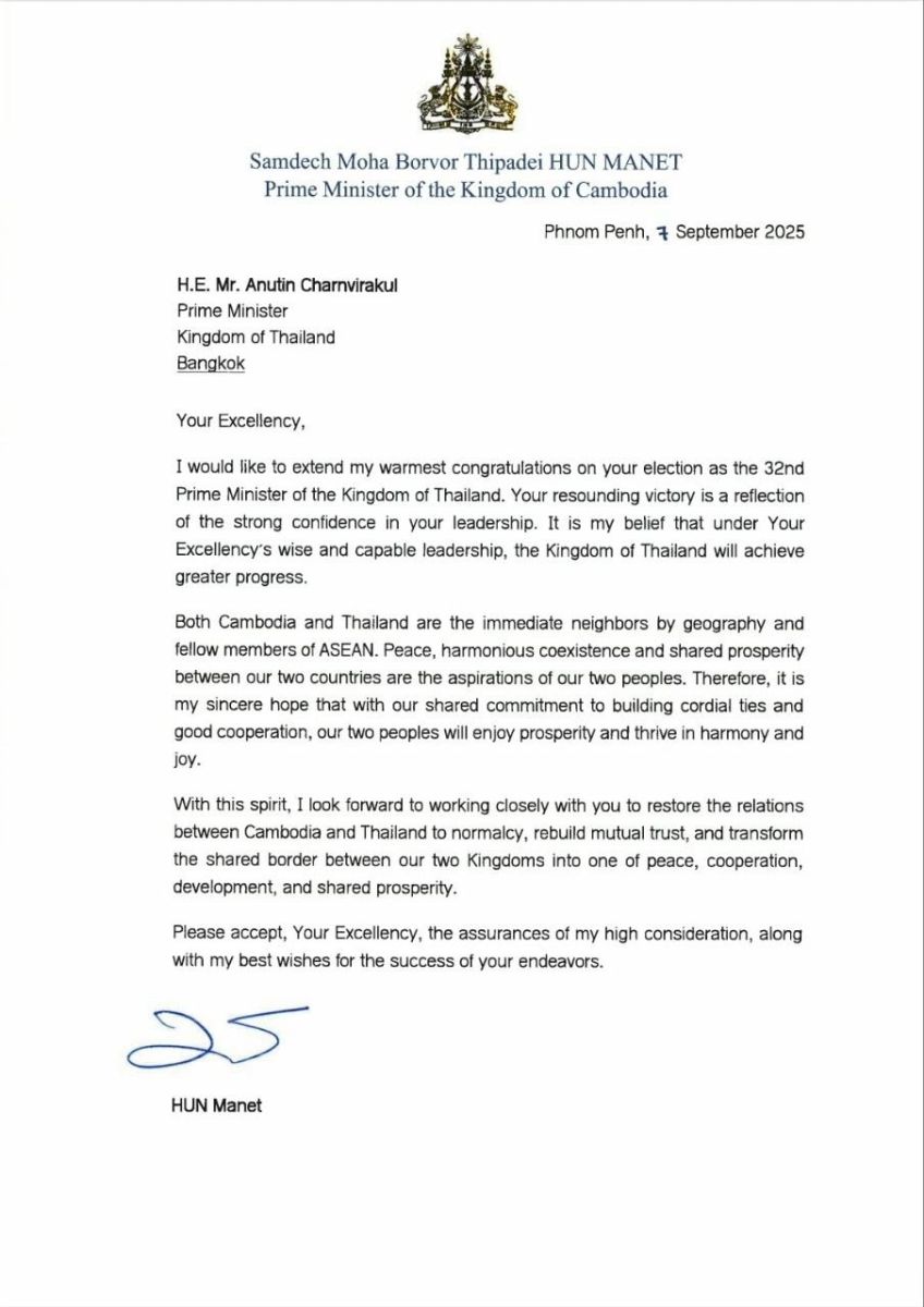 "ฮุน มาเนต" แสดงความยินดีอย่างสุดซึ้งต่อ "นายกฯ อนุทิน" เป็นนายกรัฐมนตรีคนที่ 32