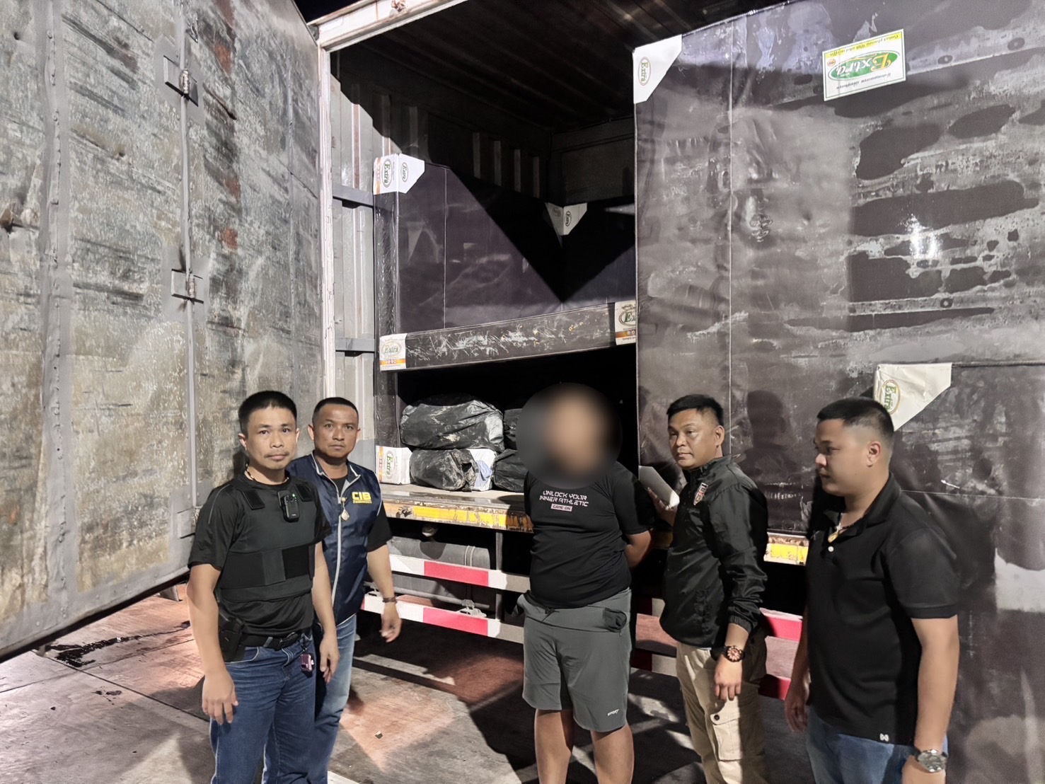 พบยาเสพติดให้โทษประเภท 1 (เมทแอมเฟตามีนหรือไอซ์) ชนิดเกล็ดผงสีขาวขุ่น บรรจุอยู่ในถุงพลาสติกสีน้ำเงิน มีรูปเต่าสีทอง มีตัวอักษร A+ สีทอง และซีนทับด้วยถุงพลาสติกใส จำนวน 600 ห่อ น้ำหนักห่อละประมาณ 1 กิโลกรัม น้ำหนักรวมประมาณ 600 กิโลกรัม แบ่งใส่กระสอบปุ๋ยจำนวน 17 กระสอบ ซึ่งบรรทุกยาเสพติดจากจังหวัดเชียงรายไปส่งให้ผู้รับที่จังหวัดสงขลา จึงได้แจ้งข้อกล่าวหาและแจ้งสิทธิให้ผู้ต้องหาทั้งสี่คนทราบ ตัวผู้ต้องหาพร้อมของกลางไปยังที่ทำการ กก.4 บก.สกส. บช.ปส. เพื่อดำเนินการขยายผล เพื่อดำเนินคดีตามกฎหมายต่อไป