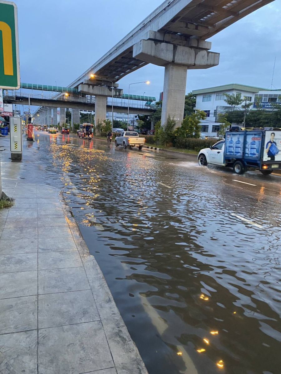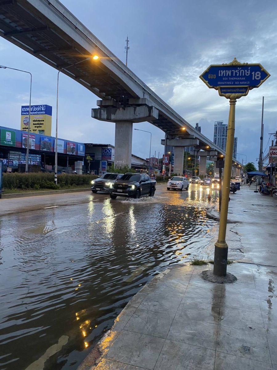 จร.สำโรงเหนือ รายงาน ถนนศรีนครินทร์ พื้นที่มีน้ำท่วมขังด้านฝั่งขาเข้าจากใต้ MRT สถานีศรีด่าน ไปถึงท้ายซอยแบริ่ง ส่วนจากโรงแรมเบย์ ไปเขตรอยต่อบางนาไม่มีท่วมขังทั้งเข้าเและออก