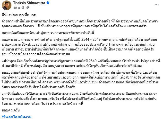 วันนี้ (9 ก.ย. 68) นายทักษิณ ชินวัตร อดีตนายกรัฐมนตรี ได้โพสต์ข้อความผ่านเฟซบุ๊กส่วนตัว แสดงความสำนึกในพระมหากรุณาธิคุณ หลังจากได้รับพระราชทานอภัยโทษ ลดโทษจำคุกคงเหลือ 1 ปี โดยระบุว่าพร้อมน้อมรับคำพิพากษา และจะใช้เวลาที่เหลือทำหน้าที่เพื่อประเทศชาติและประชาชน แม้จะไร้อิสรภาพแต่ยังคงมีเสรีภาพทางความคิด