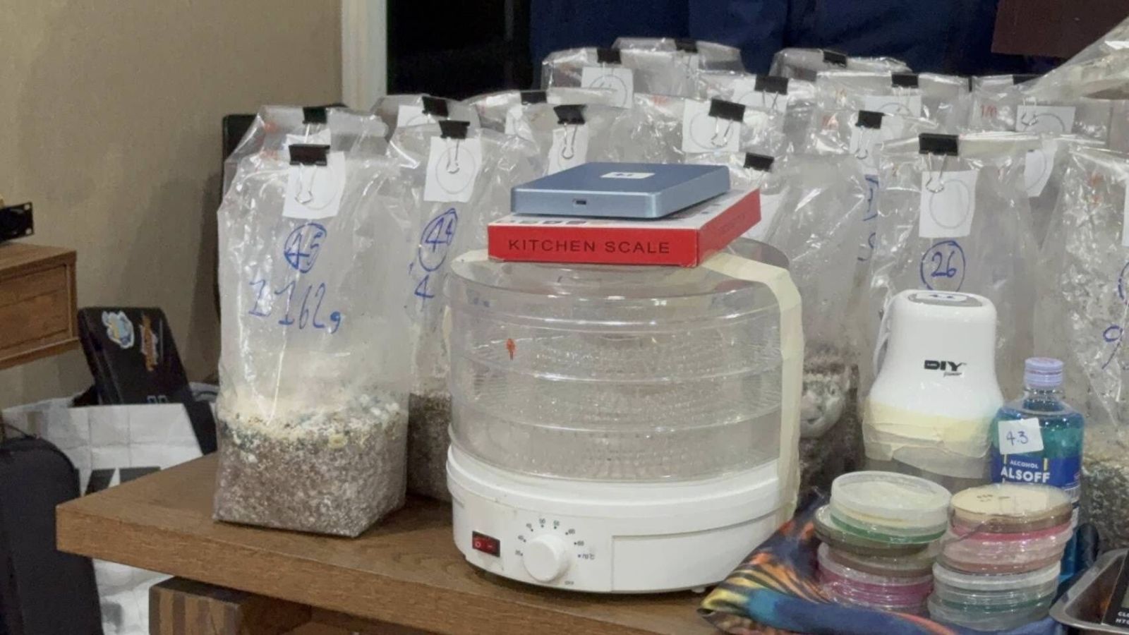 พร้อมด้วยของกลาง รวม 65 รายการ ประกอบด้วยเห็ดขี้ควายอยู่ในระหว่างเพาะปลูก 47 รายการ น้ำหนักรวมประมาณ 56 กิโลกรัม, เห็ดขี้ควายอบแห้งน้ำหนักรวม 584 กรัม พร้อมด้วยอุปกรณ์การผลิตจำนวนมาก รวมมูลค่ากว่า 2.2 ล้านบาท