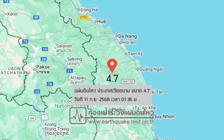 วันที่ 11 ก.ย. 2568 เวลา 01.36 น. กองเฝ้าระวังแผ่นดินไหว กรมอุตุนิยมวิทยา แจ้งเหตุ แผ่นดินไหว ขนาด 4.7 ความลึก 2 กม. ภายในพื้นที่ของประเทศเวียดนาม (15.00°N,108.07°E) ศูนย์กลางห่างออกไปทางทิศตะวันออกของ อ.เมือง จ.อุบลราชธานี ประมาณ 346 กม. ยังไม่มีรายงานผลกระทบต่อประเทศไทย