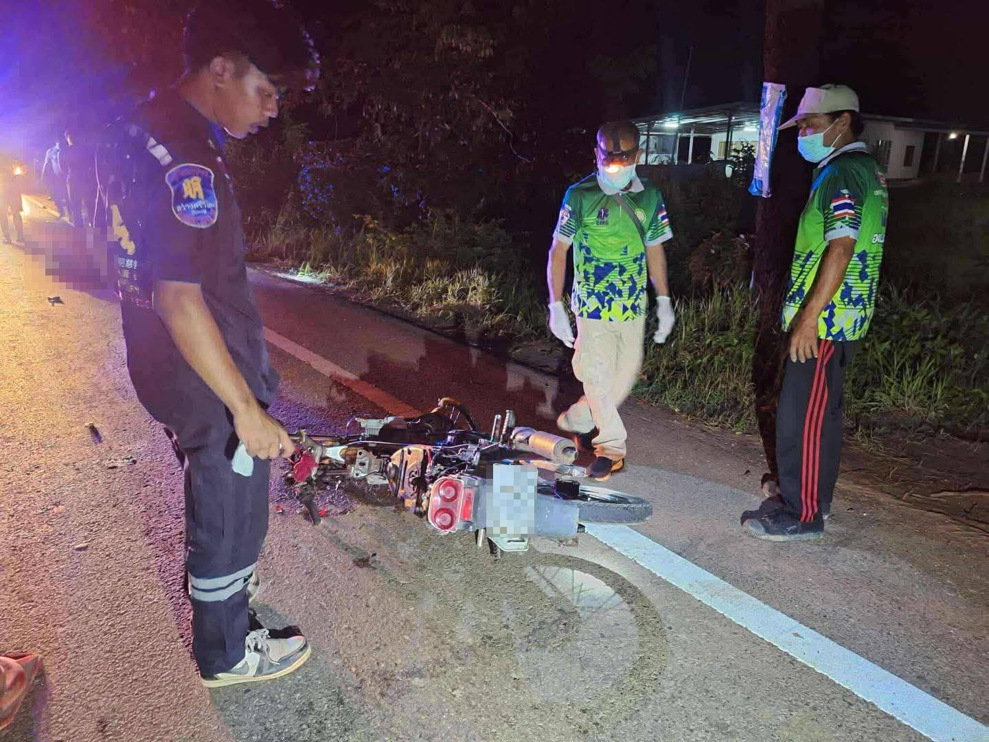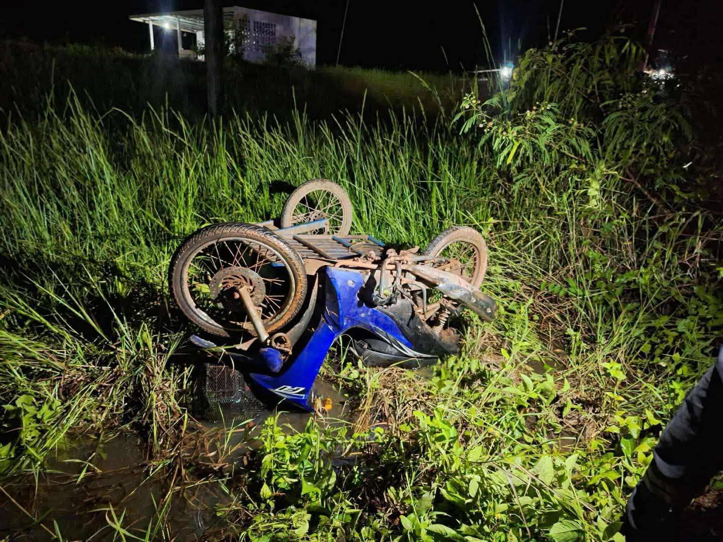 รถจักรยานยนต์ชนกับรถจักรยานยนต์พ่วงข้าง แล้วถูกรถยนต์ทับซ้ำ เสียชีวิต 1 สาหัส 1 บาดเจ็บ 2 ราย จ.บึงกาฬ