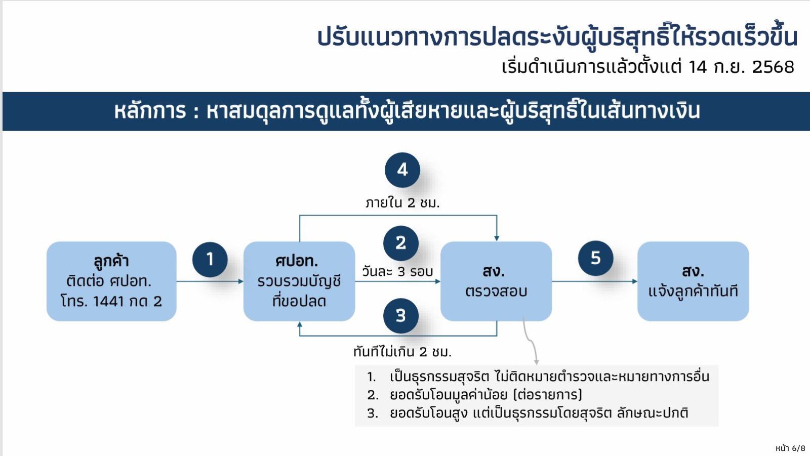 15 กันยายน 2568 น.ส.ดารณี แซ่จู ผู้ช่วยผู้ว่าการ สายกำกับระบบการชำระเงิน และคุ้มครองผู้ใช้บริการทางการเงิน ธนาคารแห่งประเทศไทย (ธปท.) เปิดเผยว่า ศูนย์ปฏิบัติการเพื่อป้องกันและปราบปรามอาชญากรรมทางเทคโนโลยี (ศปอท.) หรือ ศูนย์ AOC และธนาคารพาณิชย์ (ธพ.) เห็นชอบร่วมกันในการปรับแนวทางการระงับธุรกรรมและกรับวนการปลดการระงับ เพื่อบรรเทาผลกระทบต่อประชาชนผู้บริสุทธิ์ โดยให้ธนาคารพาณิชย์ดำเนินการดังนี้ หลัง ลูกค้าติดต่อ ศปอท. โทร 1441 กด 2 เพื่อขอปลดล็อก ธนาคารพาณิชย์จะตรวจสอบข้อมูลของผู้ได้รับผลกระทบที่ได้รับจาก ศปอท. โดยเร็วที่สุด ไม่เกิน 2 ชั่วโมง (วันละ 3 รอบ) เพื่อส่งกลับให้ ศปอท. ประมวลผล (ไม่เกิน 2 ชั่วโมง) และส่งกลับมาแจ้งธนาคารเพื่อปลดล็อค การทำธุรกรรม / ซึ่งจะใช้เวลาเร็วสุด 3-4 ชั่วโมง จากเดิม 3-7 วัน เพื่อลดผลกระทบต่อการใช้ชีวิตประจำวัน และยังป้องกันเส้นทางการเงินของมิจฉาชีพได้มีประสิทธิภาพ