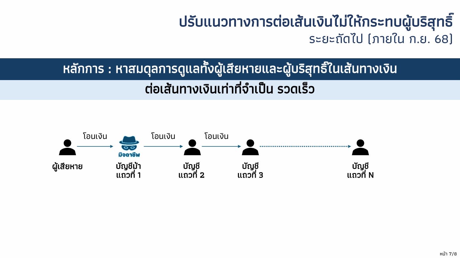 สำหรับการพิจารณาระงับธุรกรรมในเส้นเงินนั้น หน่วยงานที่เกี่ยวข้องได้เร่งปรับกระบวนการเพื่อลดผลกระทบต่อผู้บริสุทธิ์โดยเร็ว ขณะที่ยังต้องดูแลเหยื่อให้ยังได้รับความช่วยเหลือที่เหมาะสมด้วย