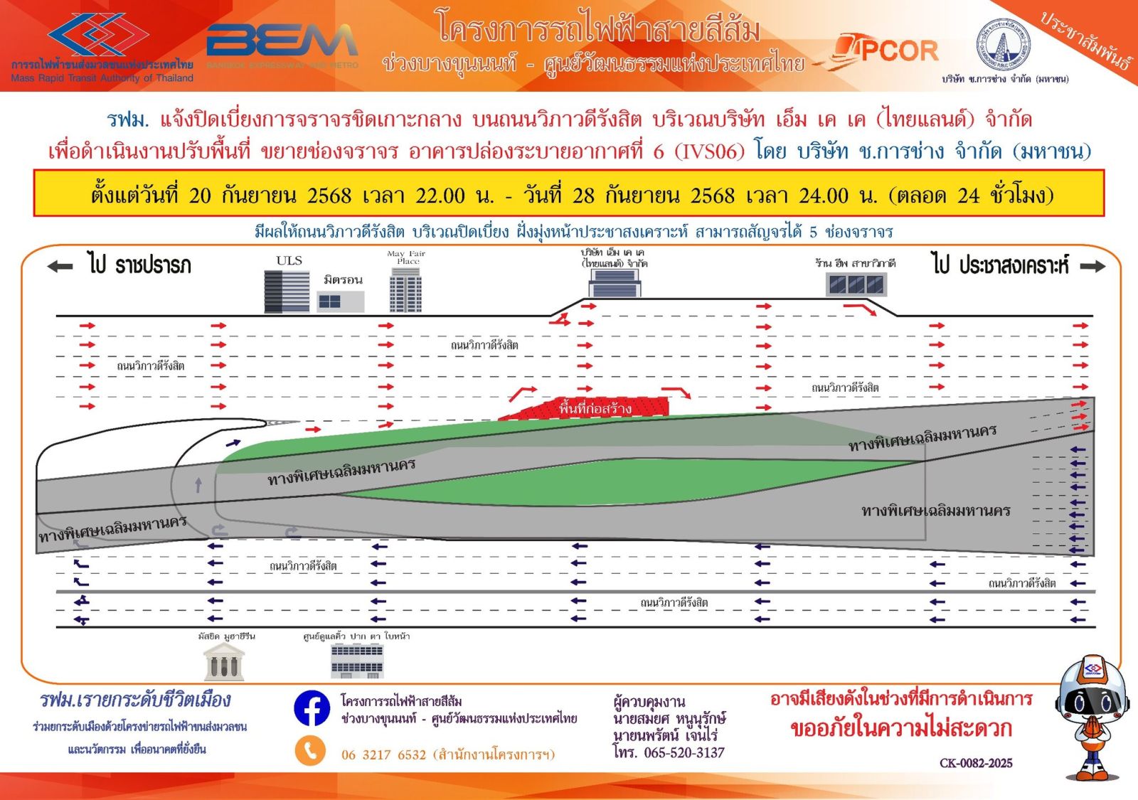 รฟม. แจ้งปิดเบี่ยงการจราจรชิดเกาะกลางบนถนนวิภาวดีรังสิต บริเวณ บริษัท เอ็ม เค เค (ไทยแลนด์) จำกัด เพื่อดำเนินงานปรับพื้นที่ ขยายช่องจราจร อาคารปล่องระบายอากาศที่ 6 (IVS06) โครงการรถไฟฟ้าสายสีส้ม ช่วงบางขุนนนท์ - ศูนย์วัฒนธรรมแห่งประเทศไทย ตั้งแต่วันที่ 20 กันยายน 2568 เวลา 22.00 น. – 28 กันยายน 2568 เวลา 24.00 น. (ตลอด 24 ชั่วโมง)